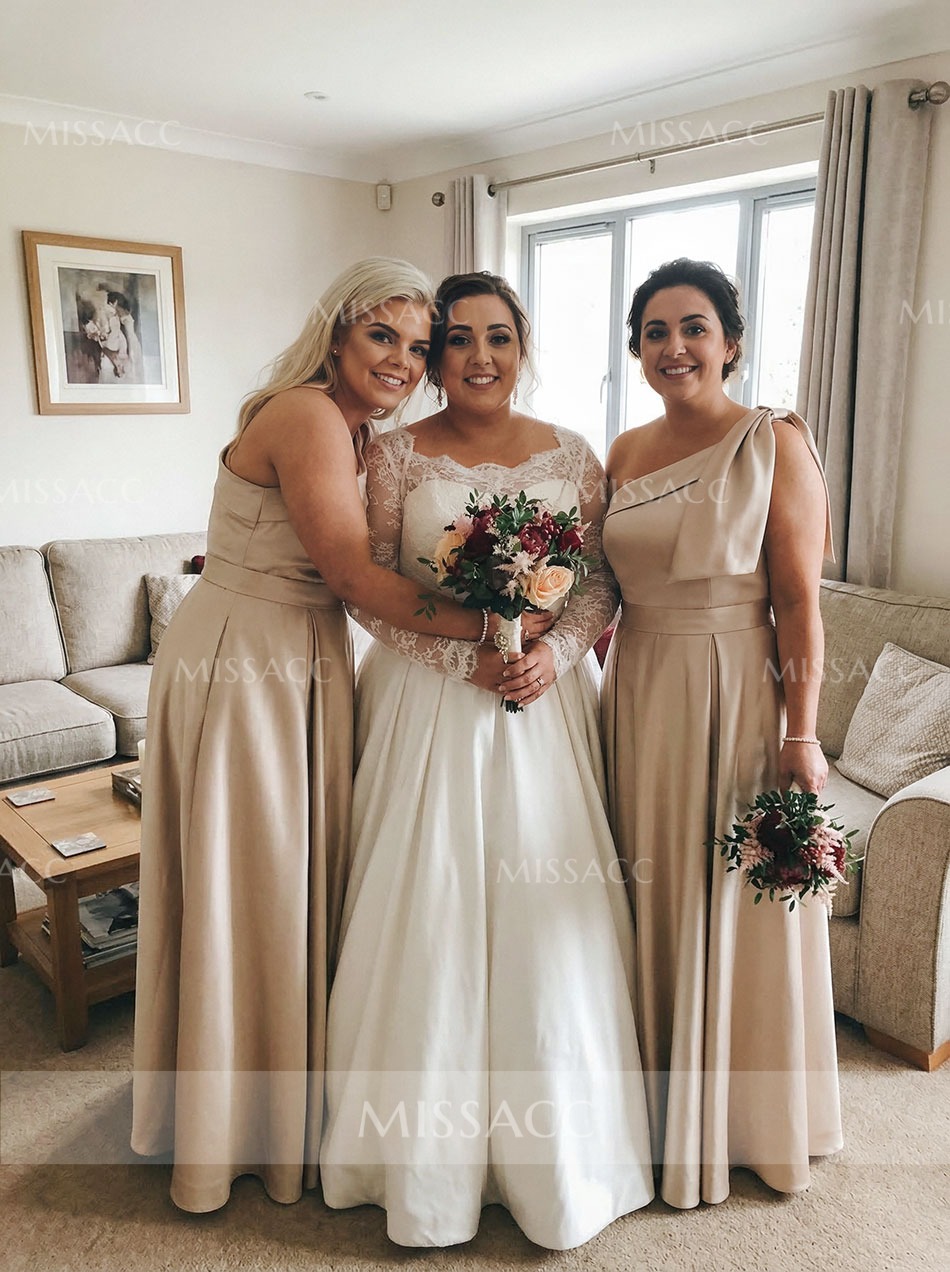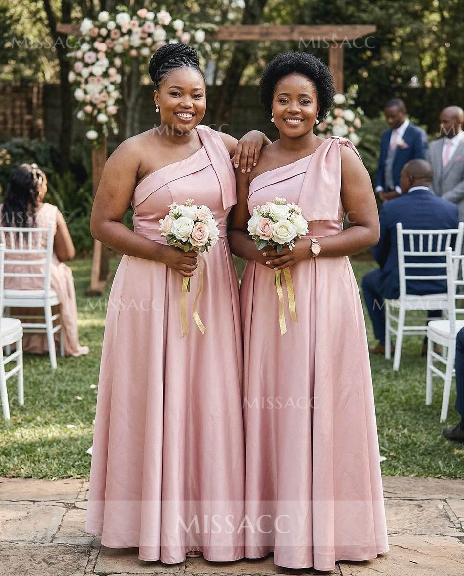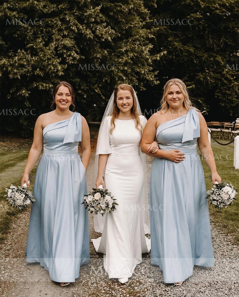 This bridesmaid dress features a one shoulder strap and an asymmetrical neckline. There are bow decorations around the shoulder straps. There are side pockets on the A-line skirt to free your hands during various activities. Two lengths, sweep train and floor-length, are available to meet your different needs. Look impeccable as you stand out for that opulent event in this bridesmaid dress.