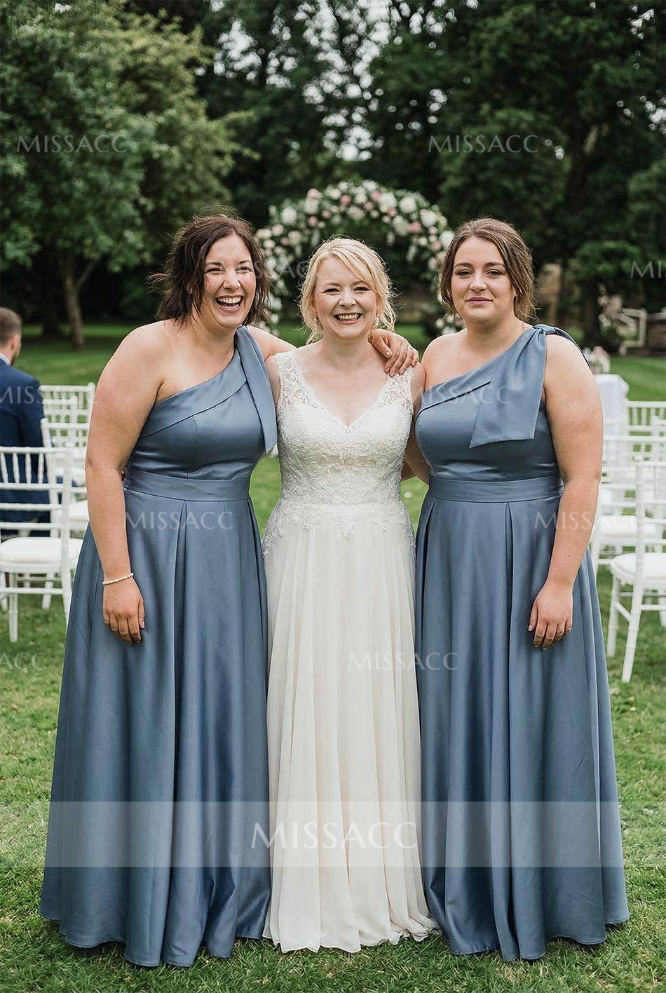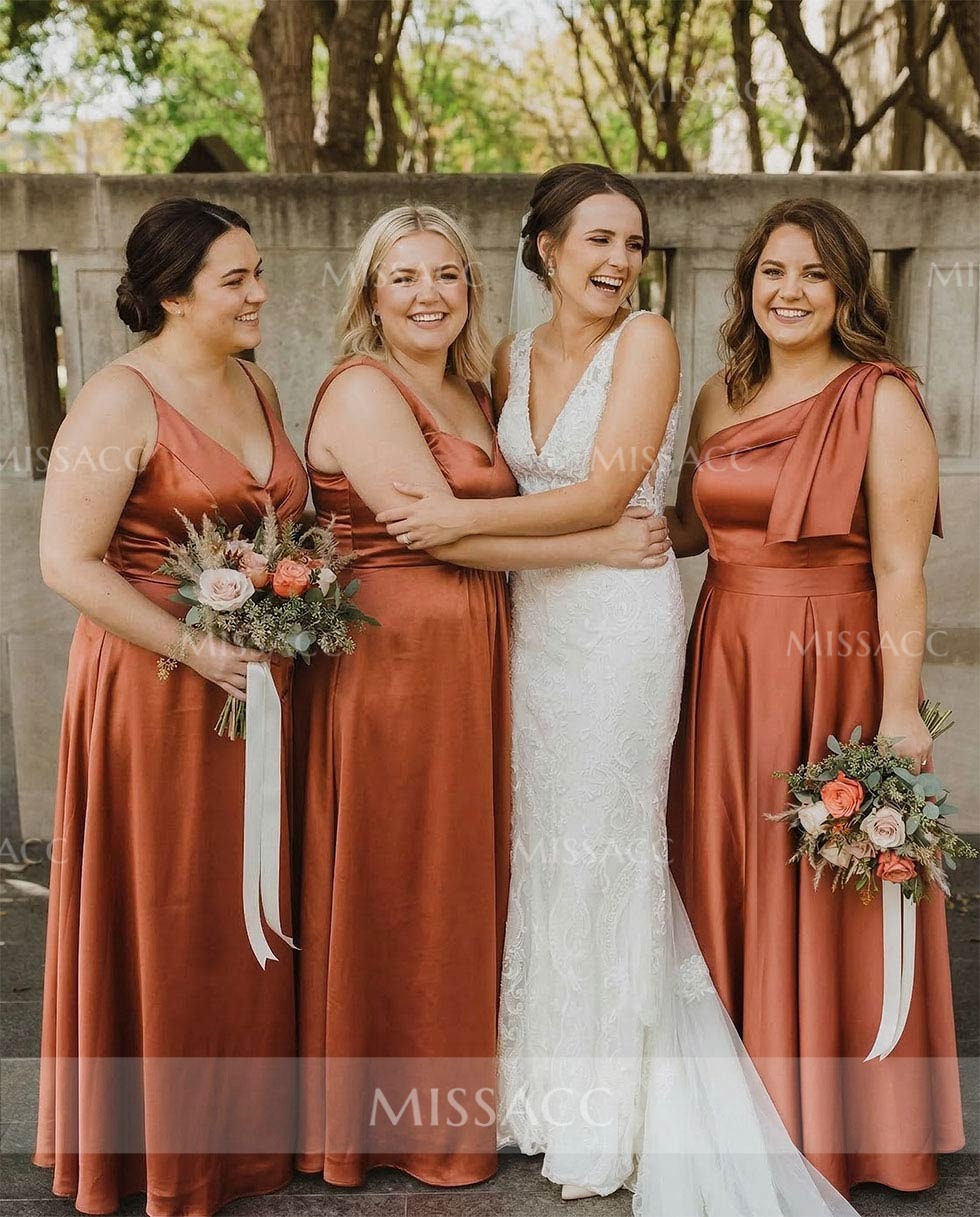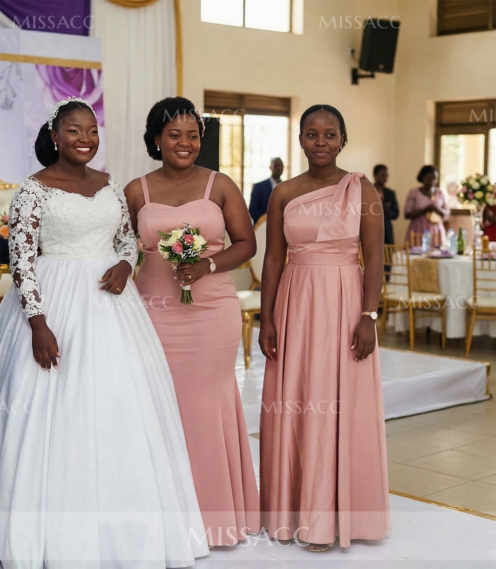 This bridesmaid dress features a one shoulder strap and an asymmetrical neckline. There are bow decorations around the shoulder straps. There are side pockets on the A-line skirt to free your hands during various activities. Two lengths, sweep train and floor-length, are available to meet your different needs. Look impeccable as you stand out for that opulent event in this bridesmaid dress.