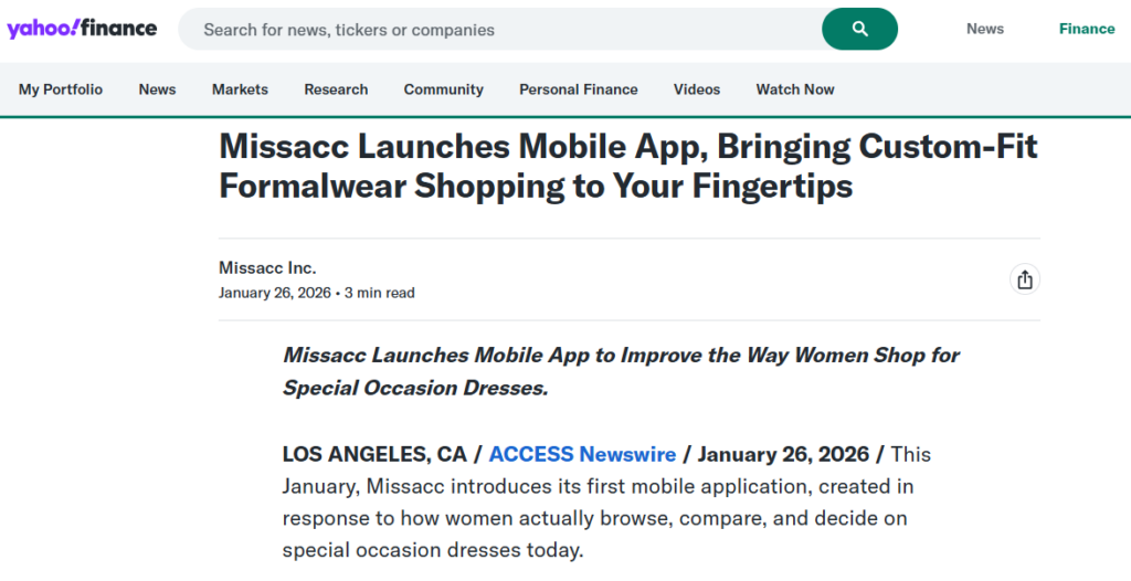 Missacc Launches Mobile App, Featured on Yahoo: Revolutionizing Formalwear Shopping