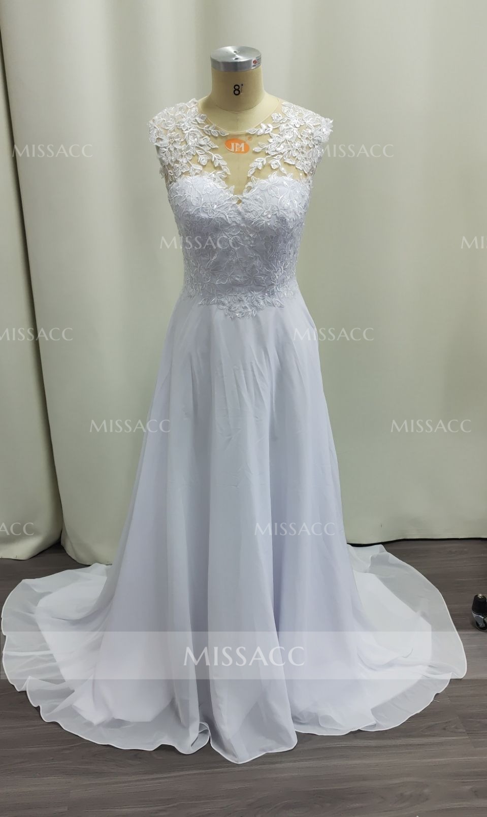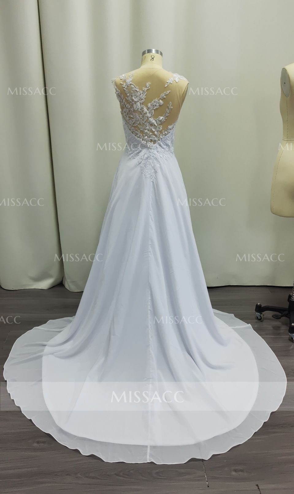 A-line Chiffon Wedding Dress with Lace, High Neck, Sleek Style for Elegant Occasions.