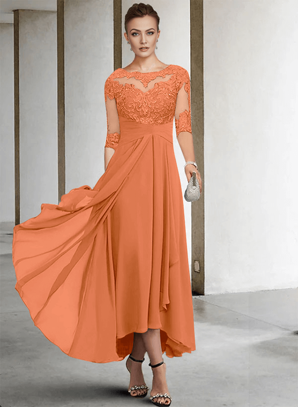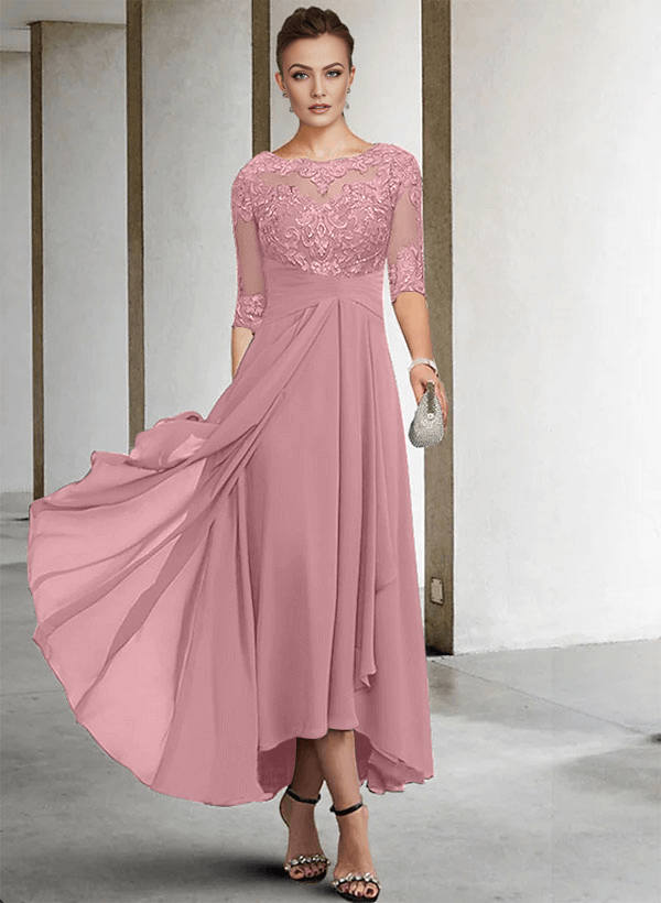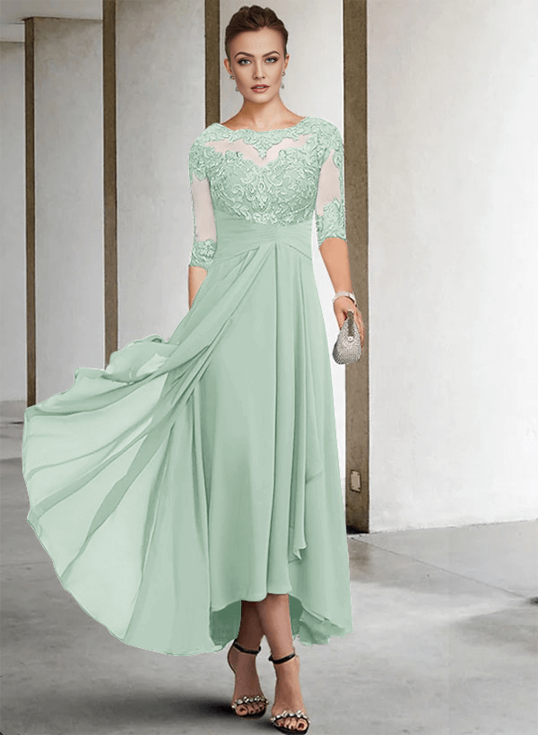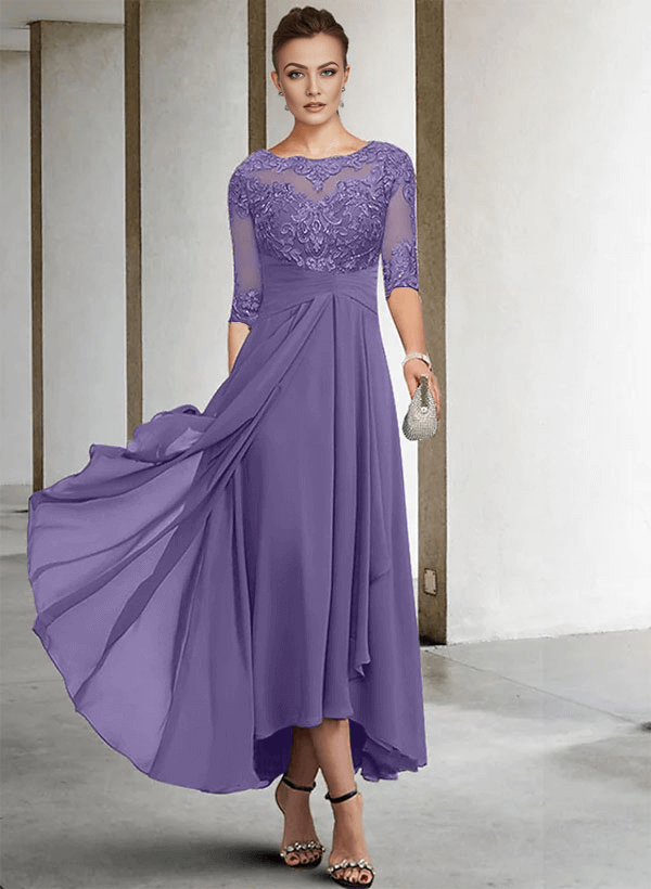 "Chic A-line chiffon lace dress with a scoop neck, perfect for the mother of the bride. Soft fabric, elegant design for special occasions."