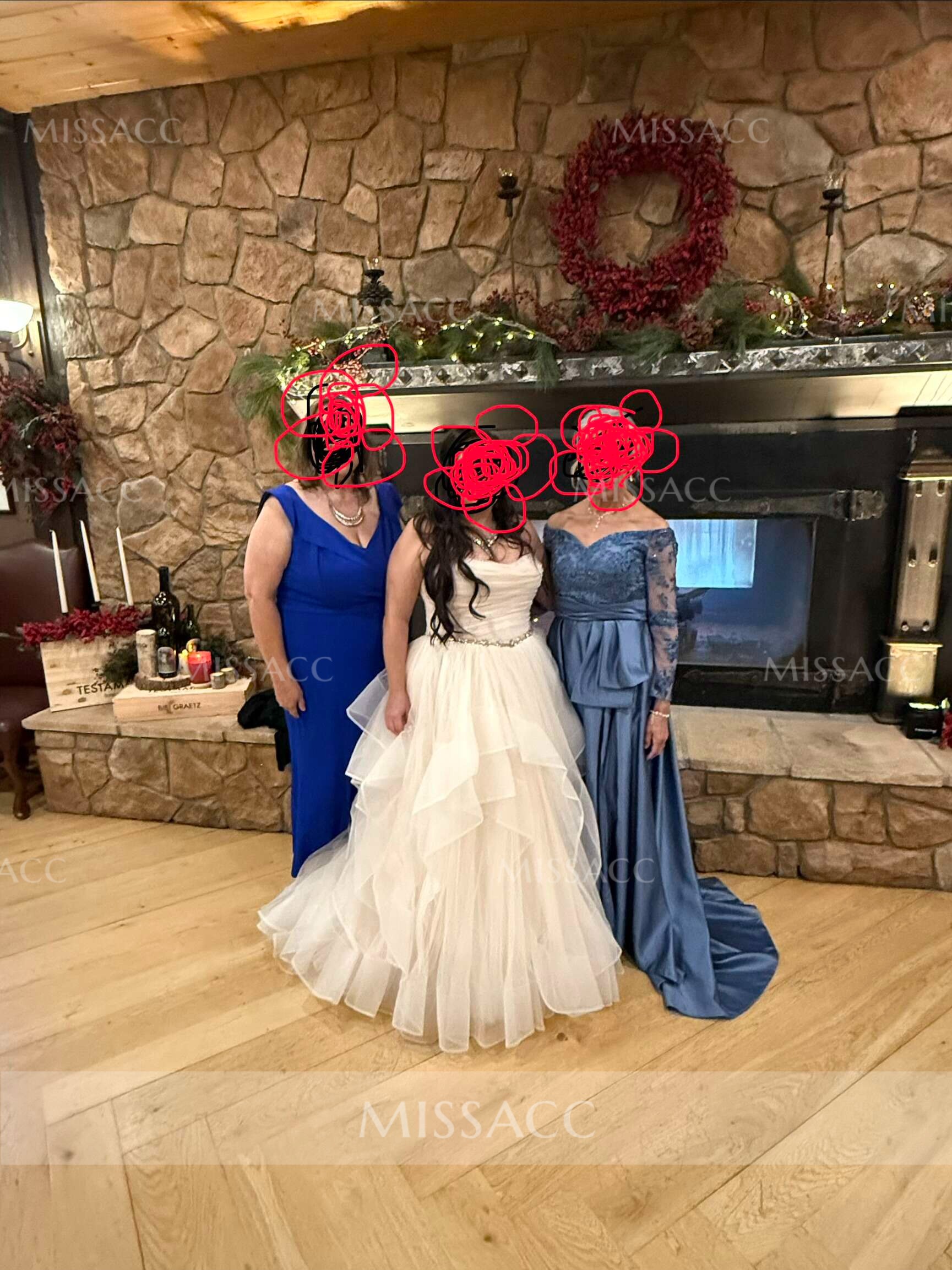 "Stunning off-shoulder lace satin mother of the bride dress with a sweep train and split front detail. Perfect for a sophisticated wedding event."