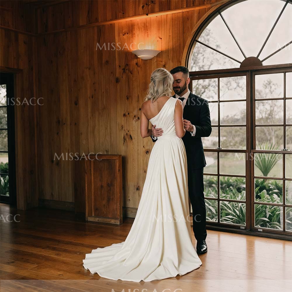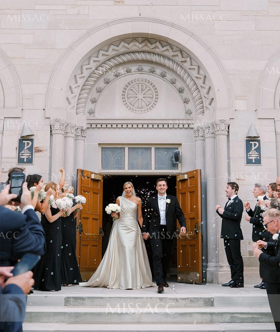 Stunning A-line satin wedding dress with a detachable one-shoulder sleeve. Timeless elegance for your special day.