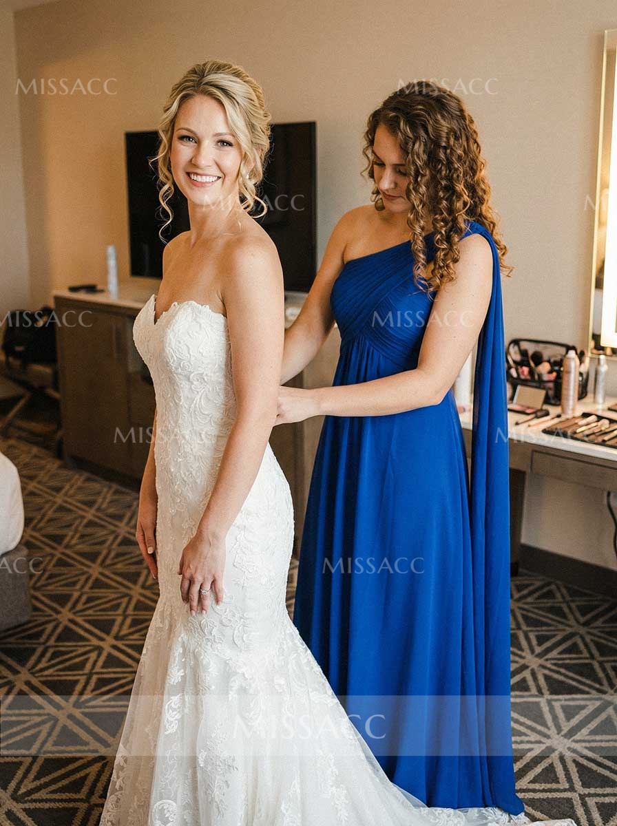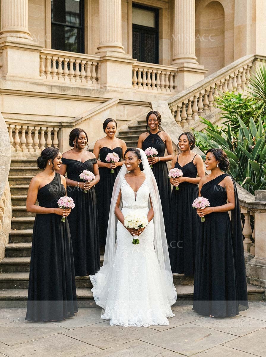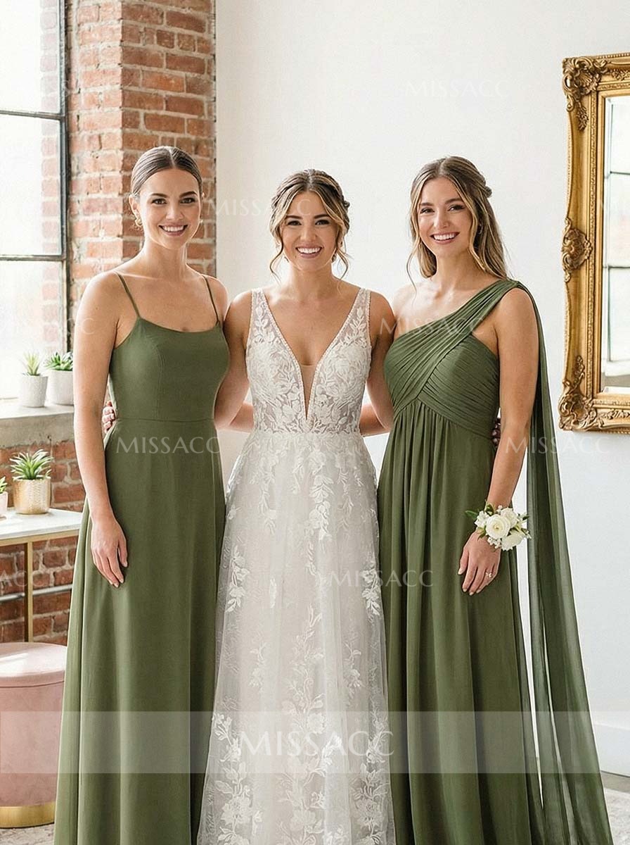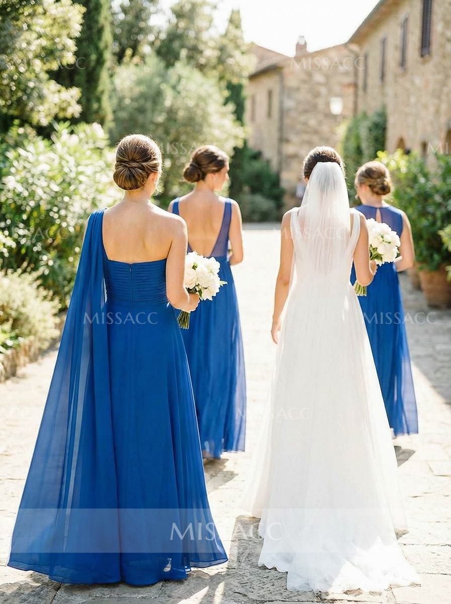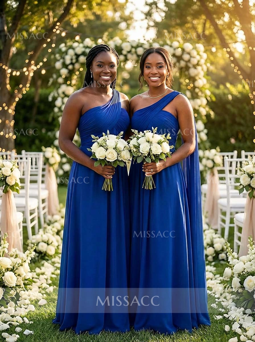 Stunning A-line, one-shoulder, sleeveless floor-length chiffon bridesmaid dress. Timeless elegance for special occasions. Perfect for weddings and formal events.