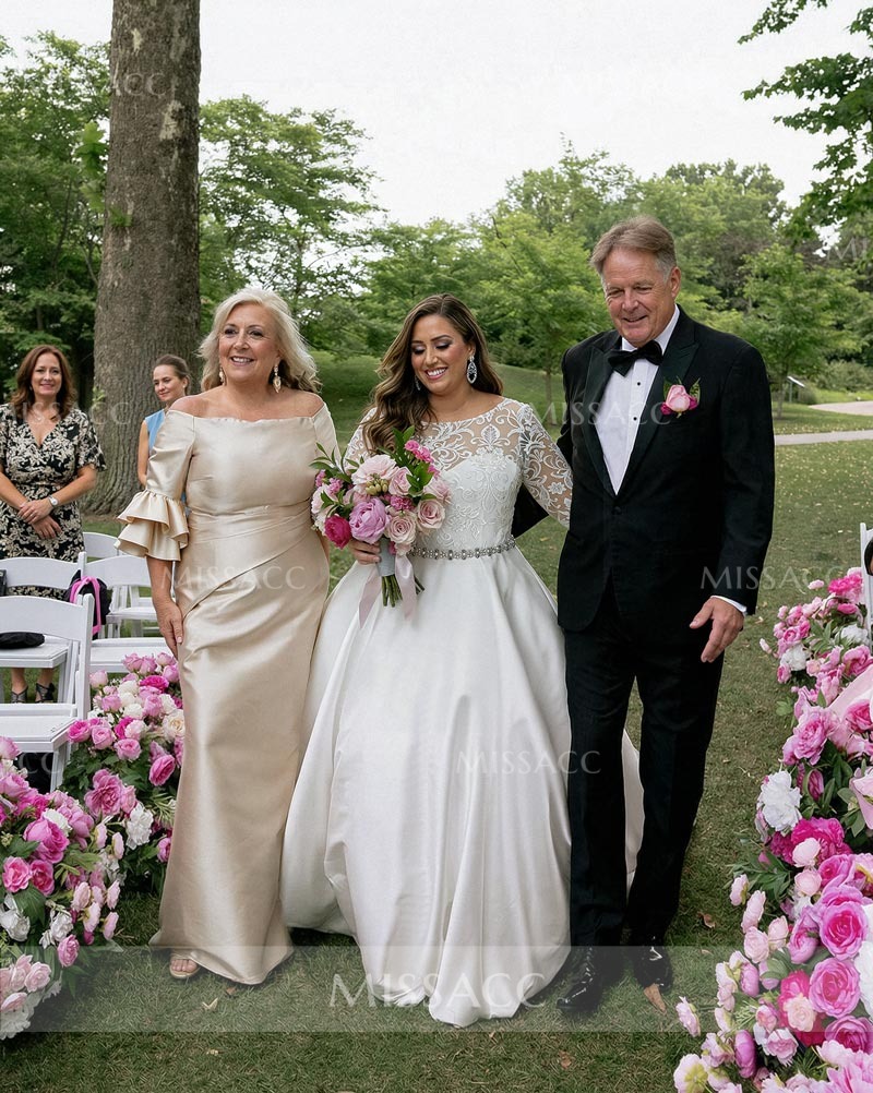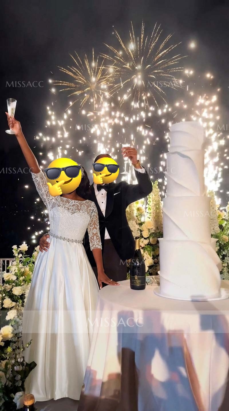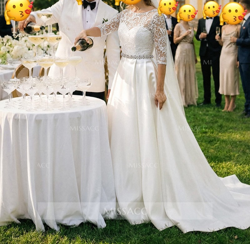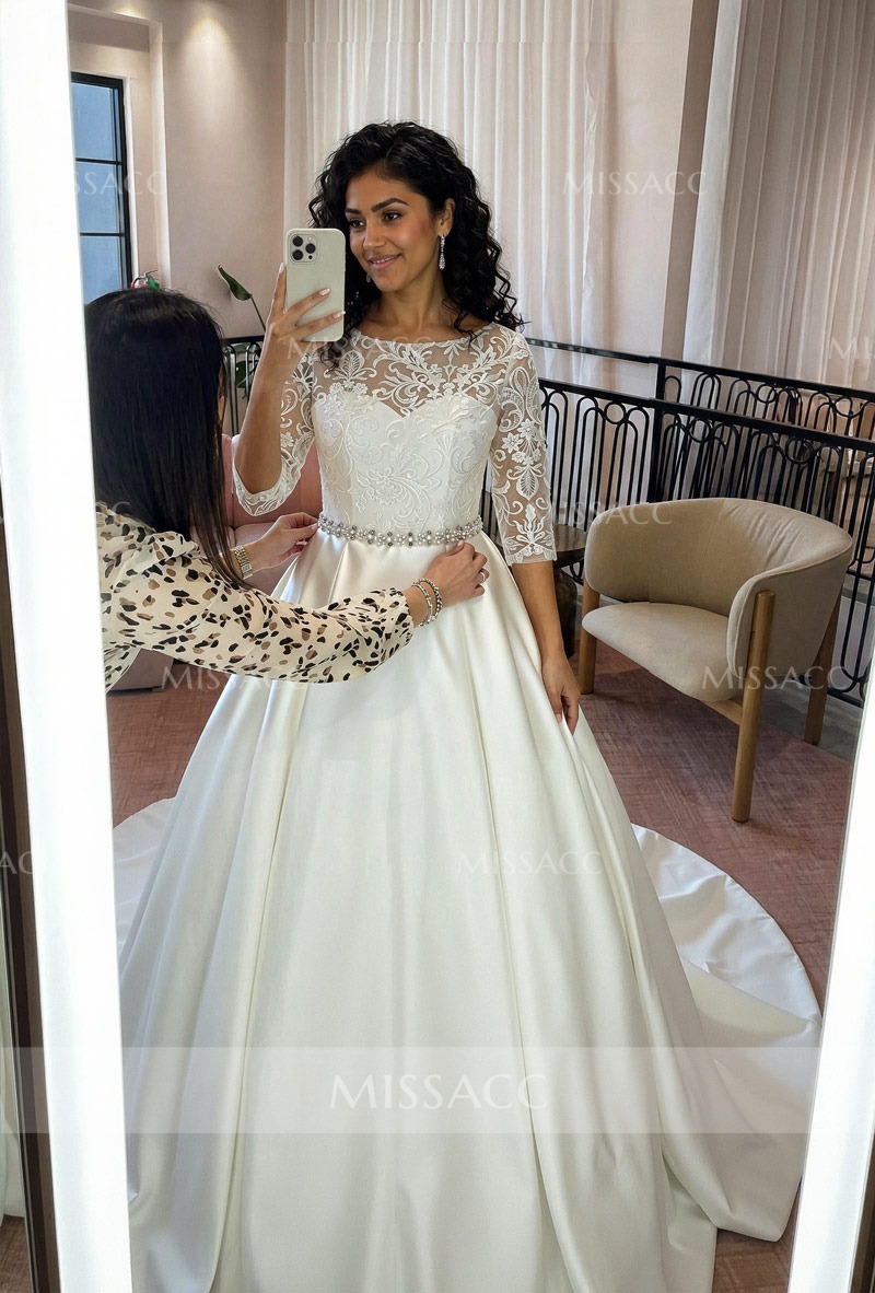 Satin wedding dress with lace, a-line silhouette, scoop neck, and pockets. Perfect for a chic, modern ceremony.