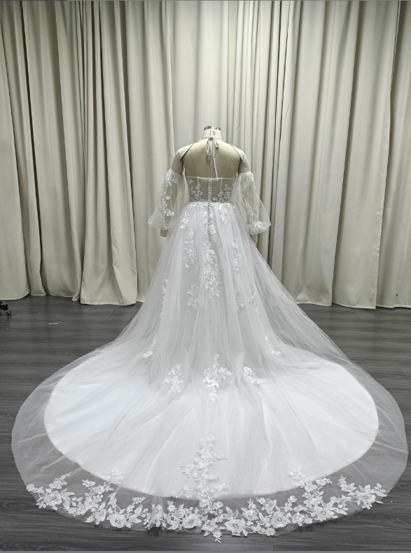 A-Line Sweetheart Detachable Sleeves Chapel Train Chiffon Tulle Wedding Dresses With Appliques Lace #SWD12880