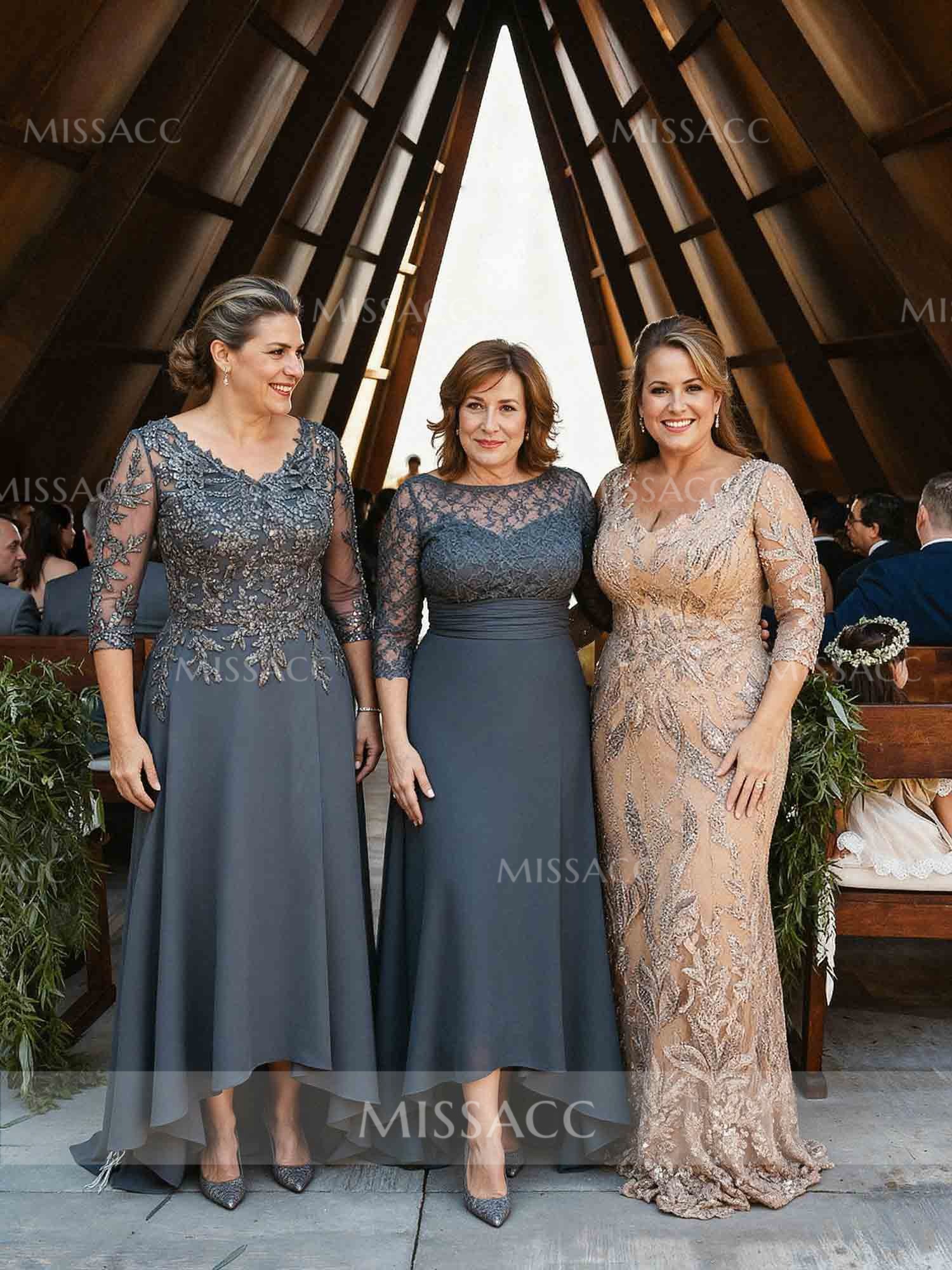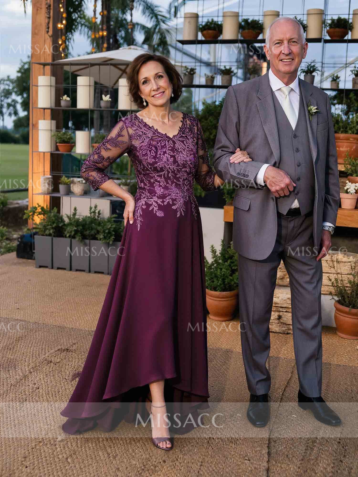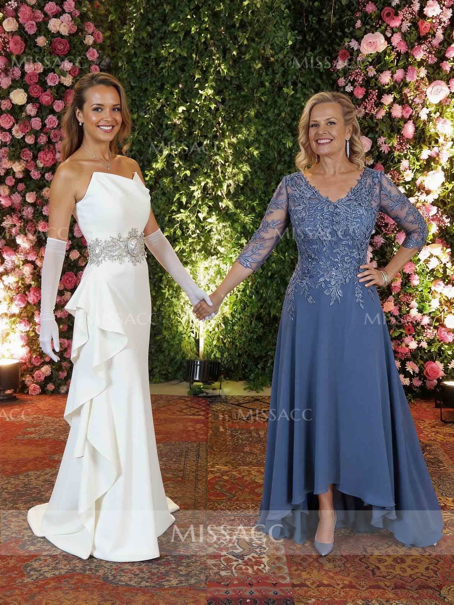Elegant A-line V-neck chiffon mother-of-the-bride dress with lace detailing, perfect for a sophisticated wedding event. Soft 3/4 sleeves add a touch of grace.