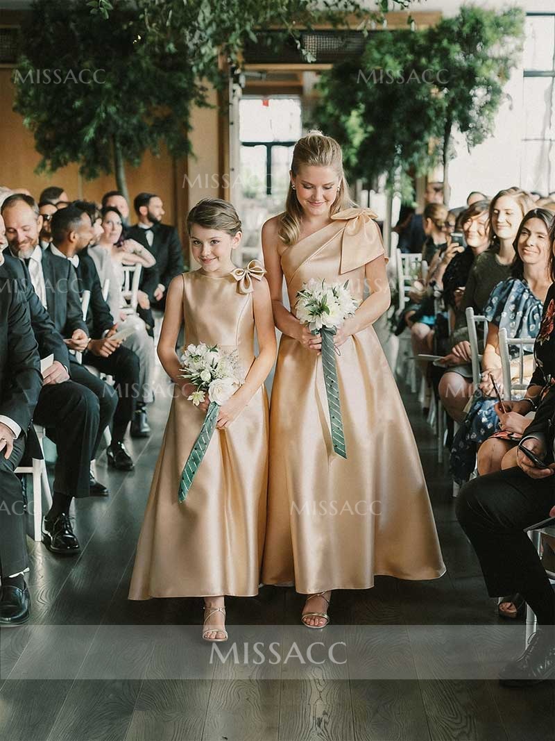 Chiffon junior bridesmaid dresses with a-line silhouette and v-neck design, featuring a stylish bow accent for a chic wedding look. Perfect for special occasions.
