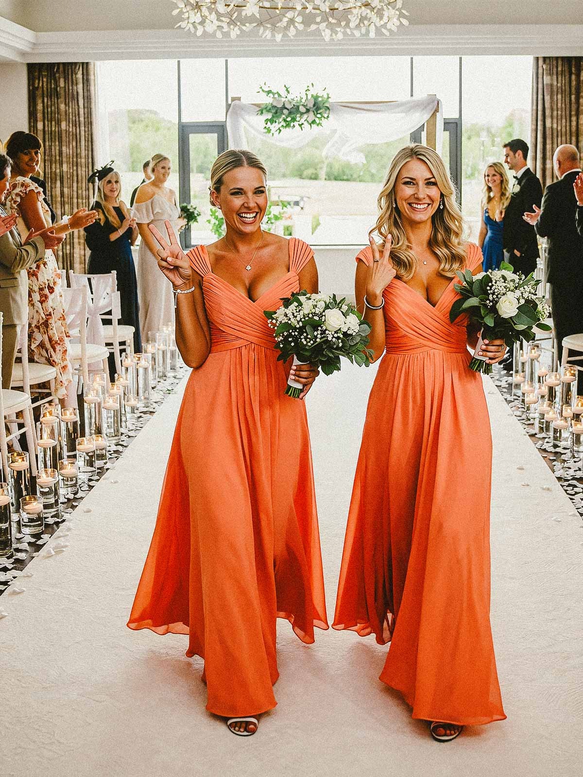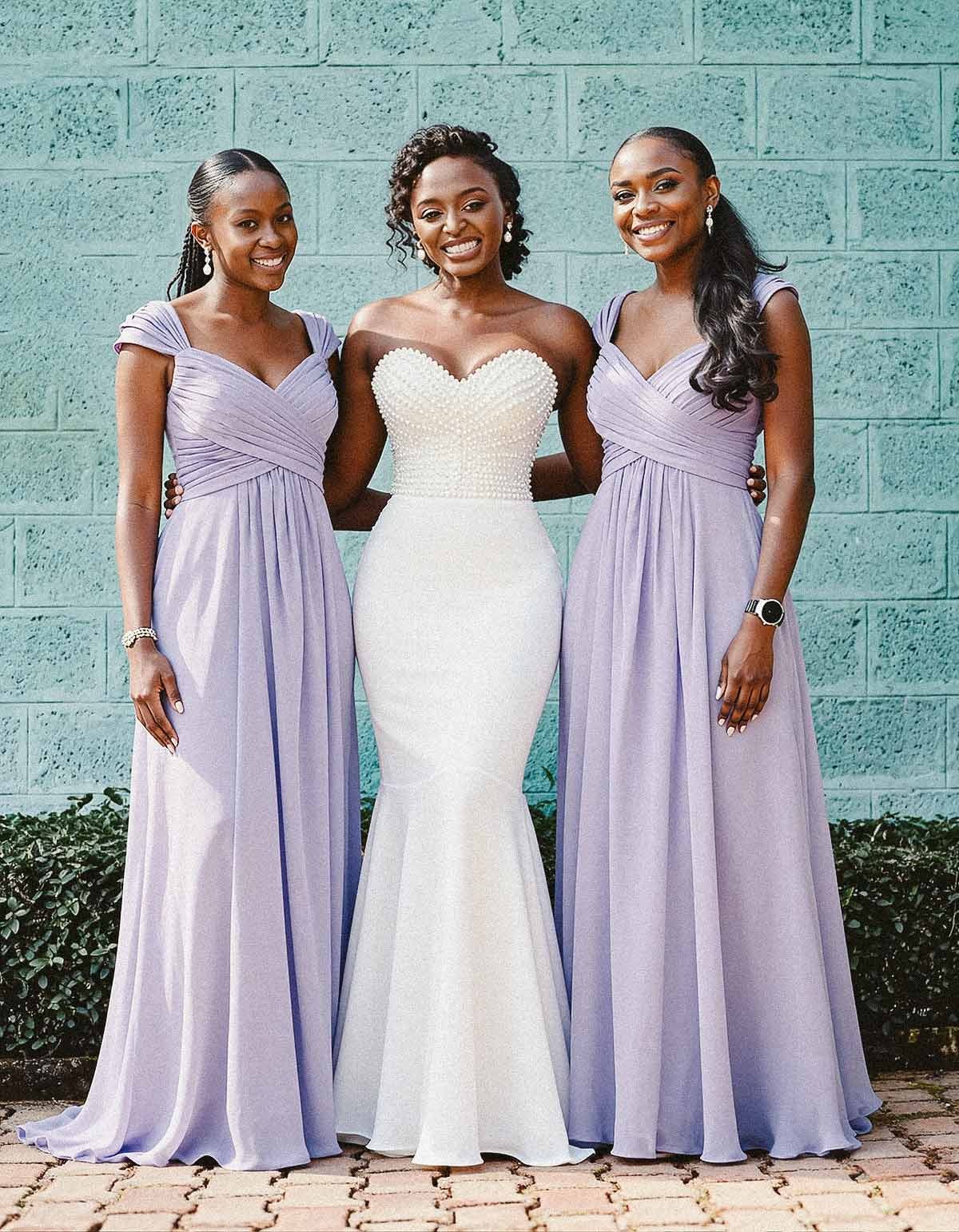 Discover our A-line V-neck sleeveless floor-length chiffon bridesmaid dresses, perfect for a chic and sophisticated wedding celebration. Soft and flowing, these dresses add a touch of grace to any event.