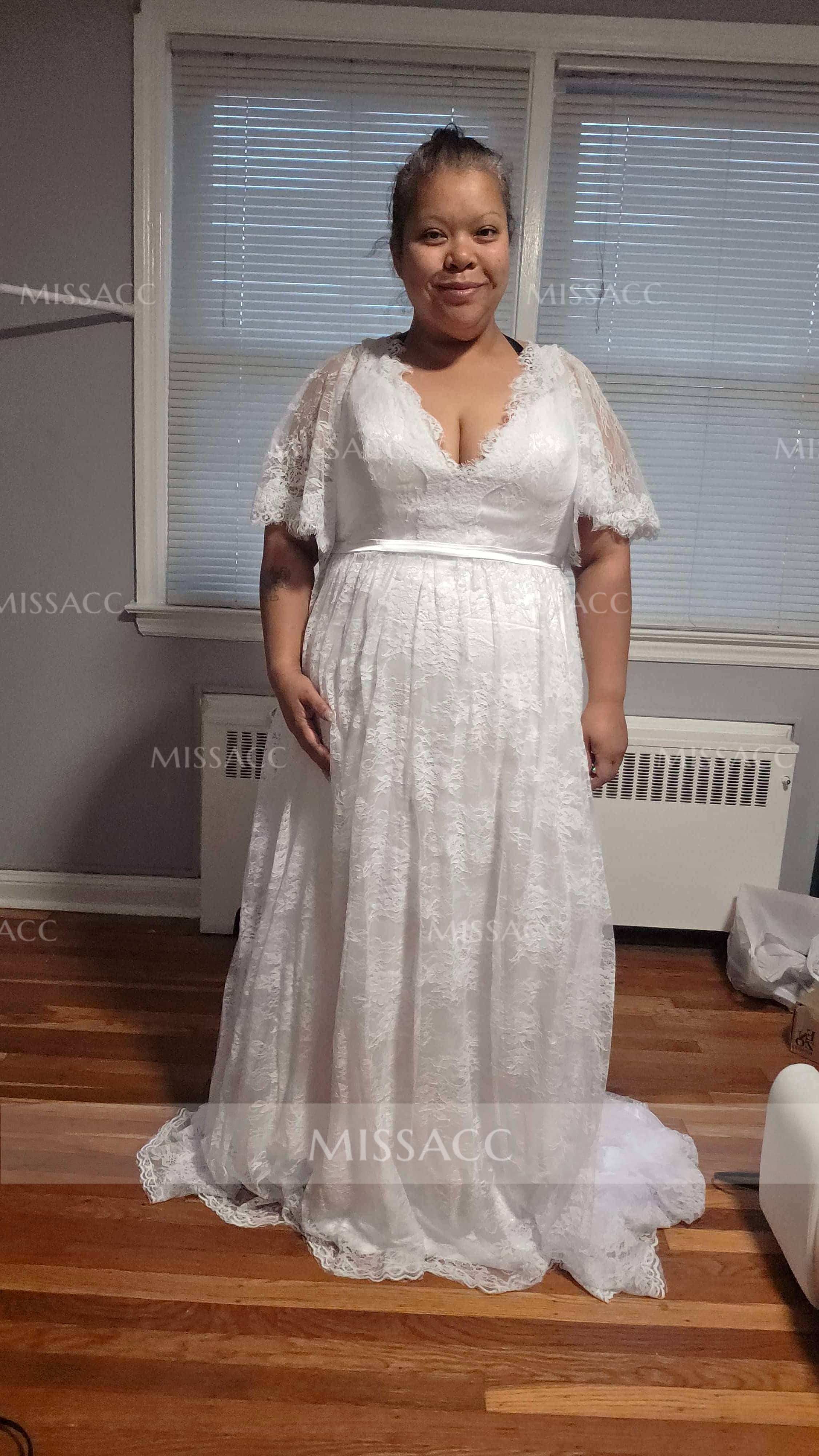 A-line V-neck lace tulle wedding dress, featuring a sweep train and sleeveless design for a chic bridal look. Perfect for a romantic wedding ceremony.