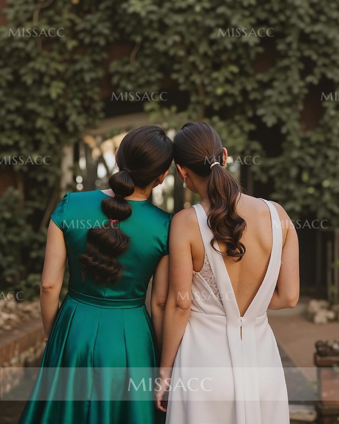 Classic V-neck short-sleeve satin bridesmaid dress. Featuring convenient pockets and a flattering A-line silhouette, this ankle-length gown is perfect for weddings and formal events. A sophisticated choice for any special occasion.