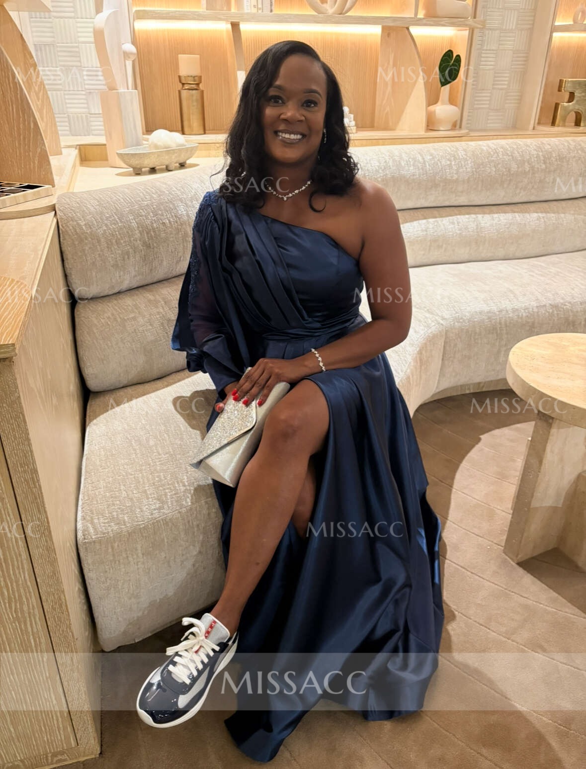 This satin evening gown is absolutely breathtaking! The one-shoulder design is incredibly flattering, and the long sleeves add a sophisticated touch of elegance. It fits like a dream, and I got so many compliments! Definitely a fantastic purchase!