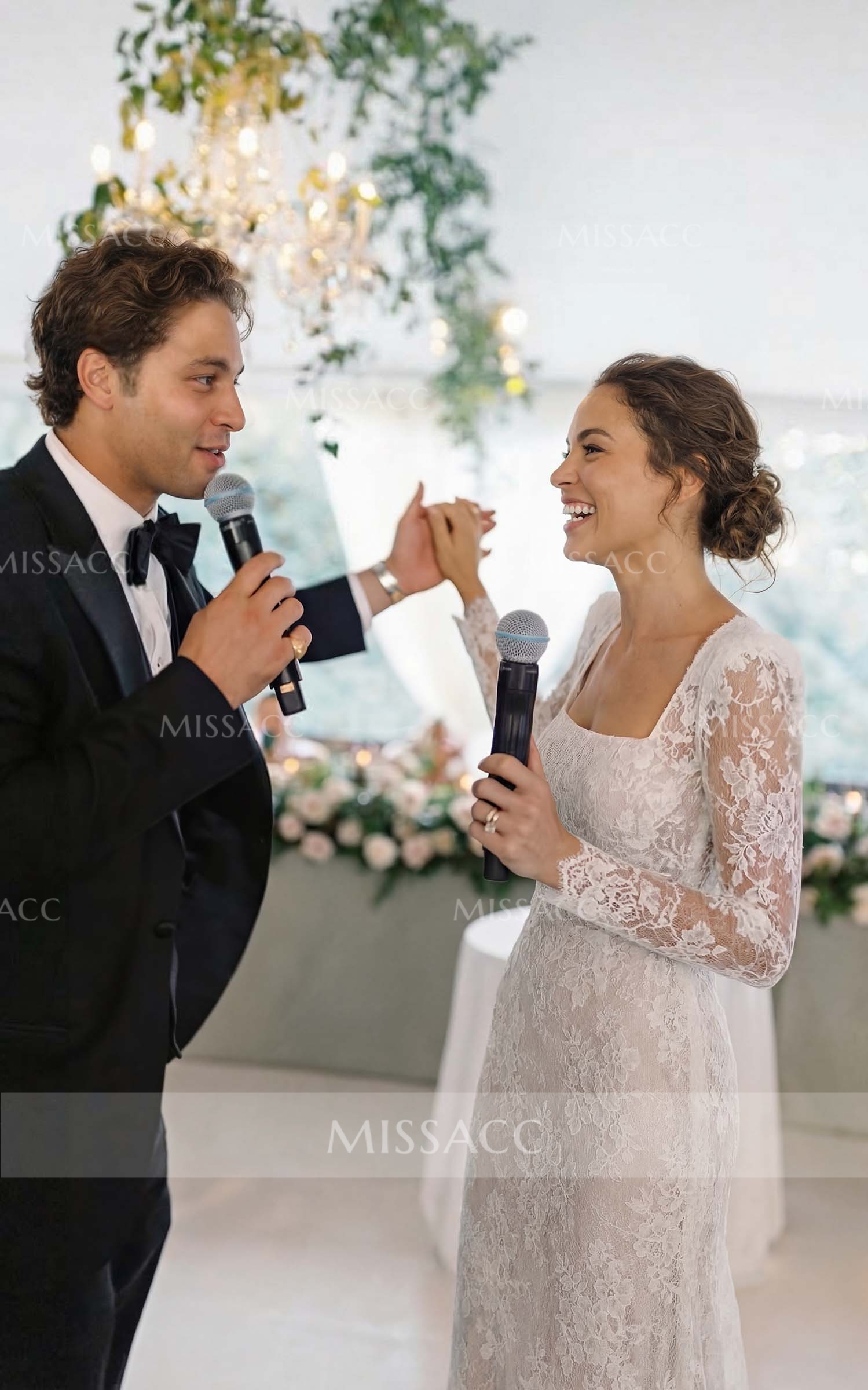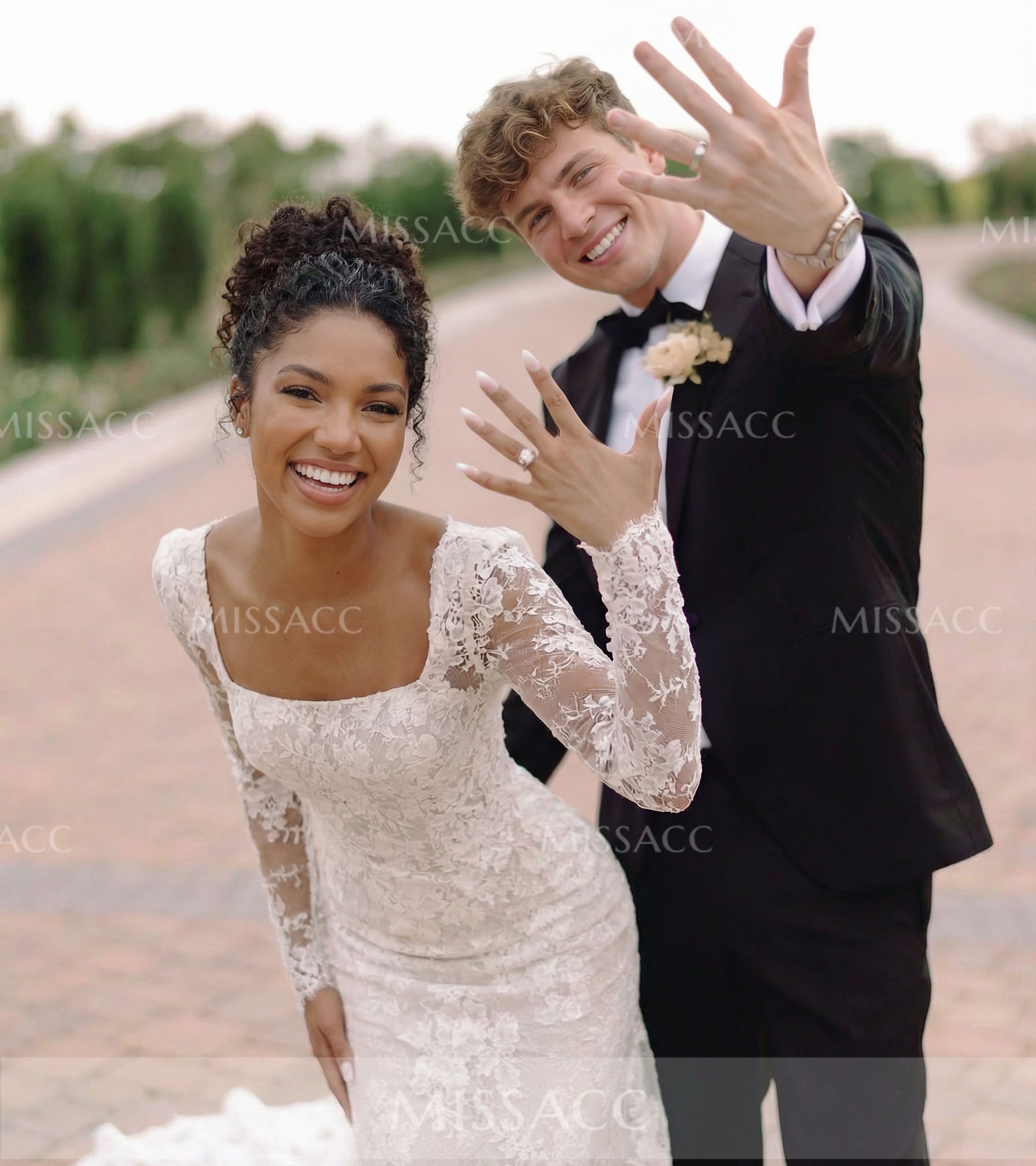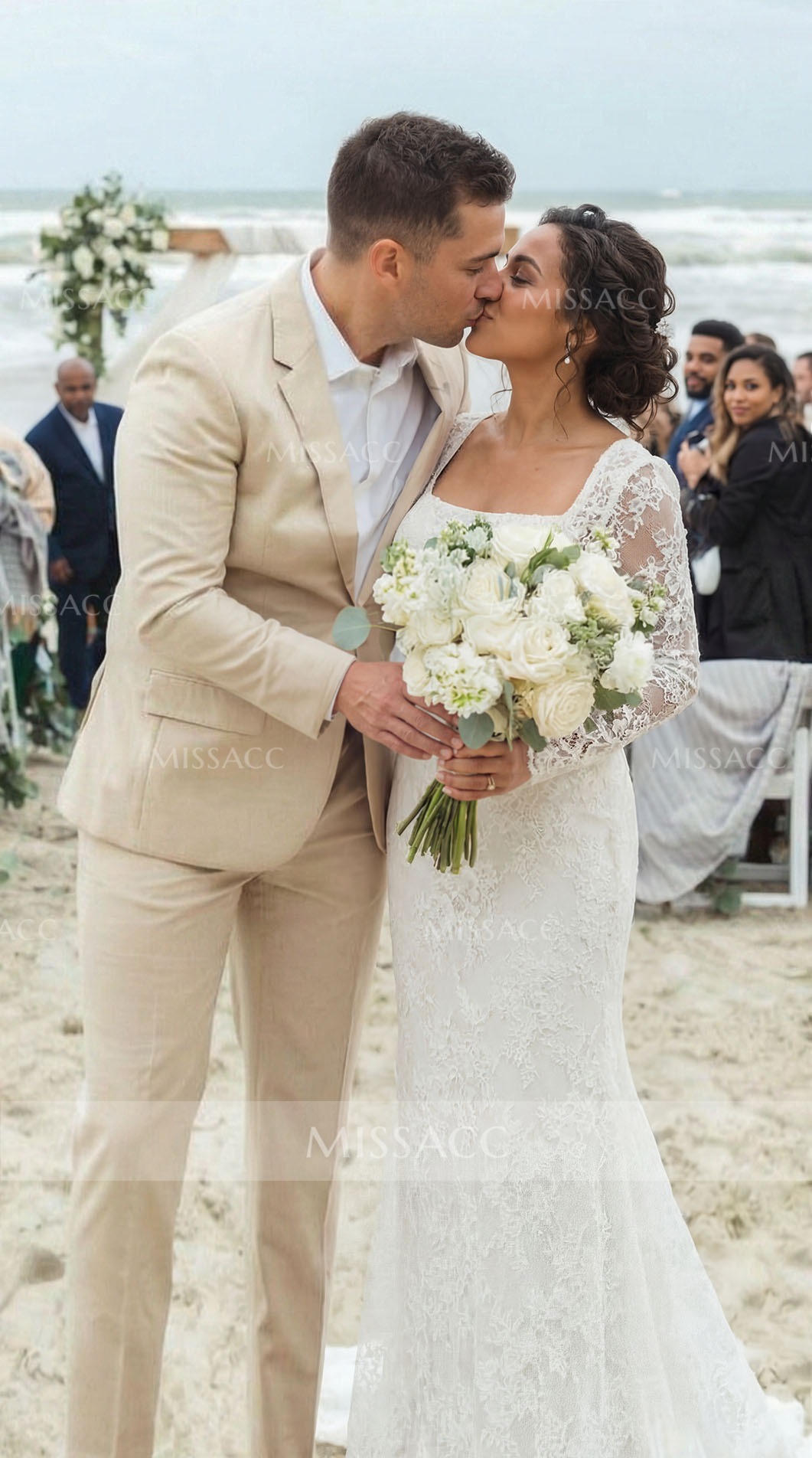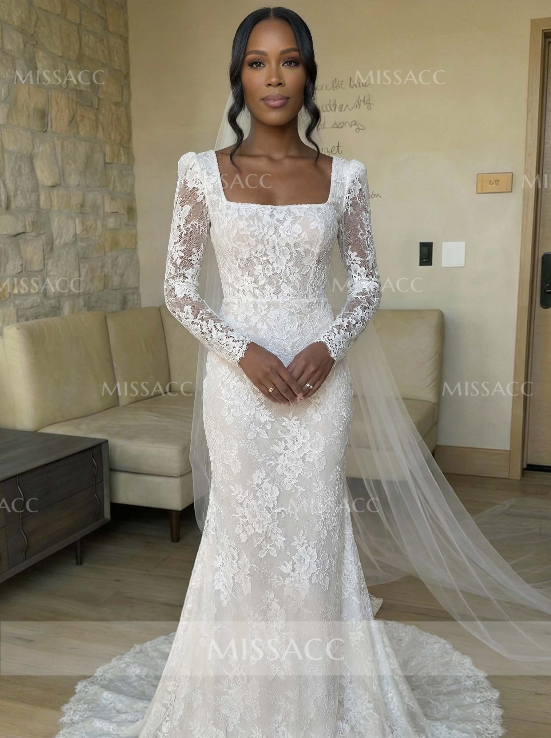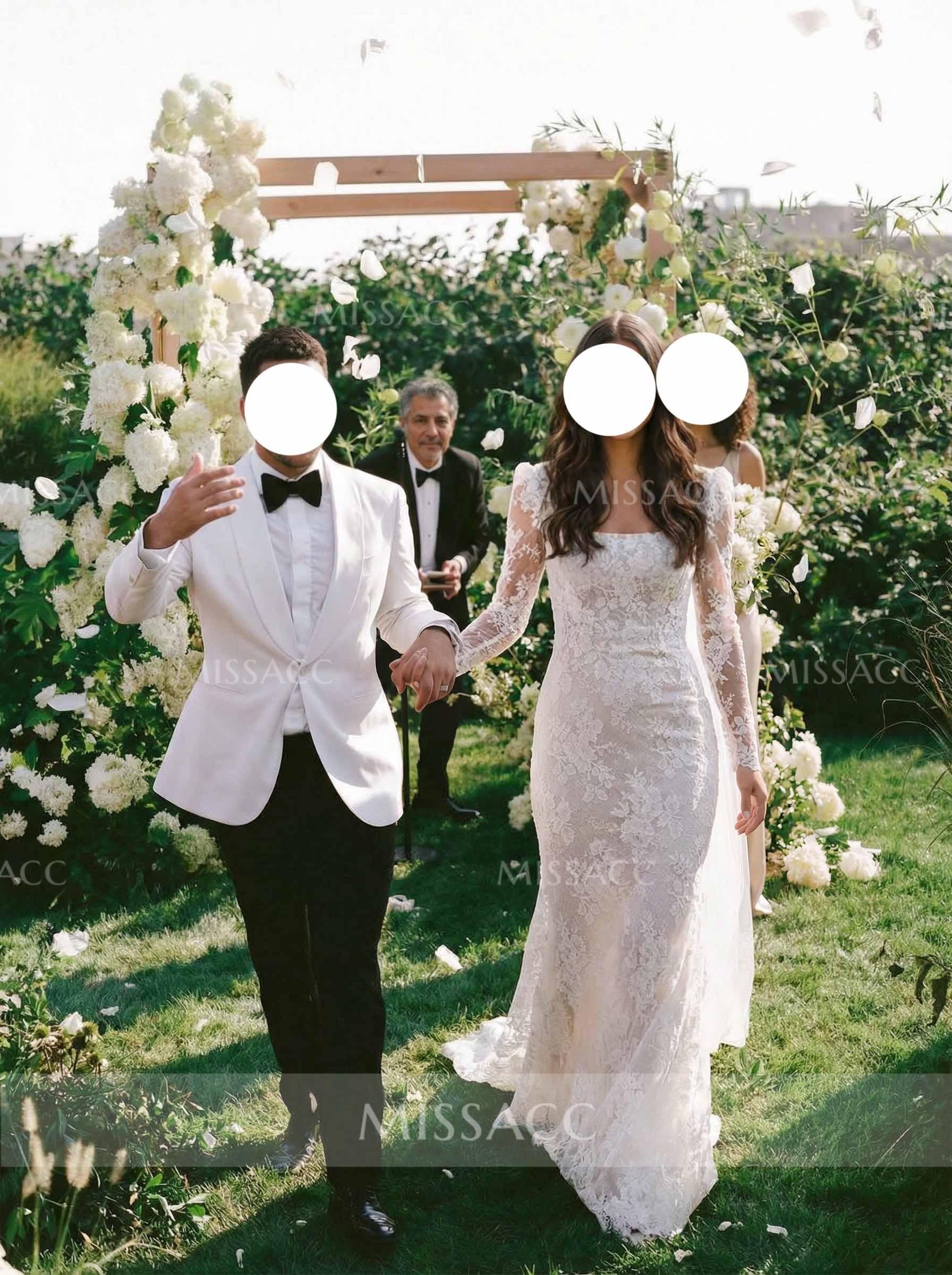 Lace Wedding Dress with Square Neckline and Detachable trail. Exquisite lace crafting, modern square neck, and versatile long sleeves offer a chic silhouette perfect for your special day. Shop bridal gowns online.