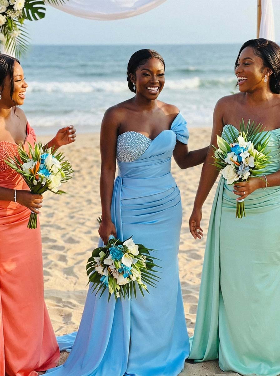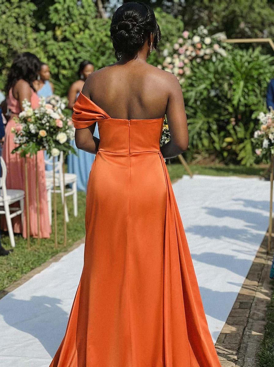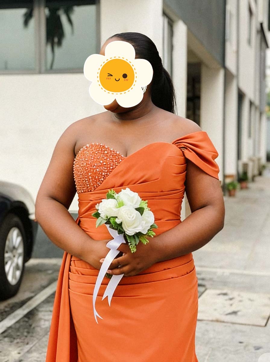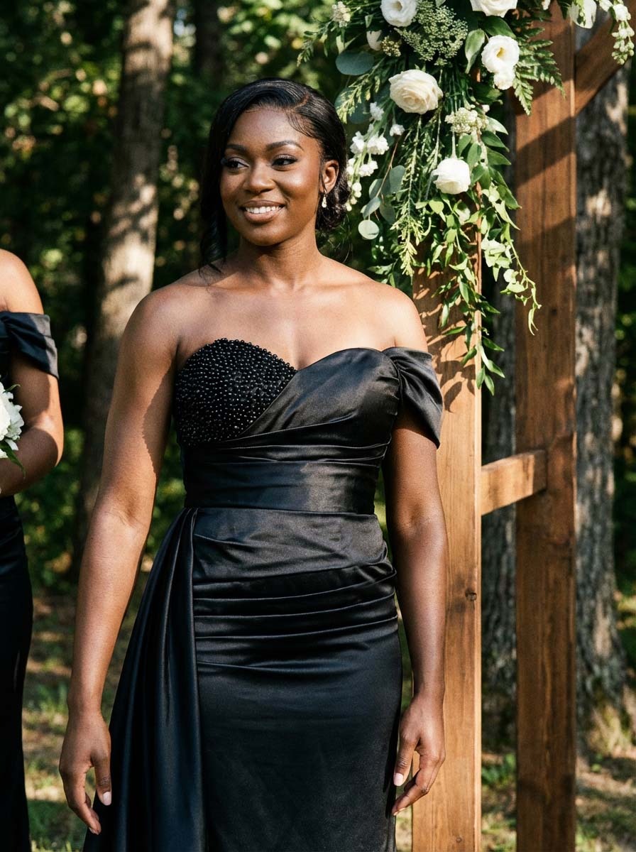 So, I bought this dress for my cousin's wedding last month. The satin fabric feels nice, but the fit was a bit off around the hips, so I had to get it altered. The side drape looks cool in pictures, but it felt kind of heavy after wearing it all day. It’s okay for the price.