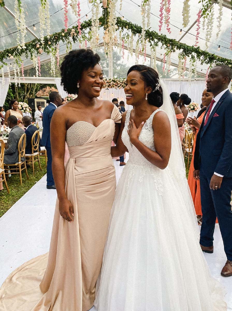 The dress looked great in photos during the outdoor reception, especially with that side drape style. But man, the fabric wrinkles so easily! I spent forever steaming it before the event. Also, the sweep train is nice but got dirty way too fast on the grass. It's decent for the price, just be prepared for some maintenance.