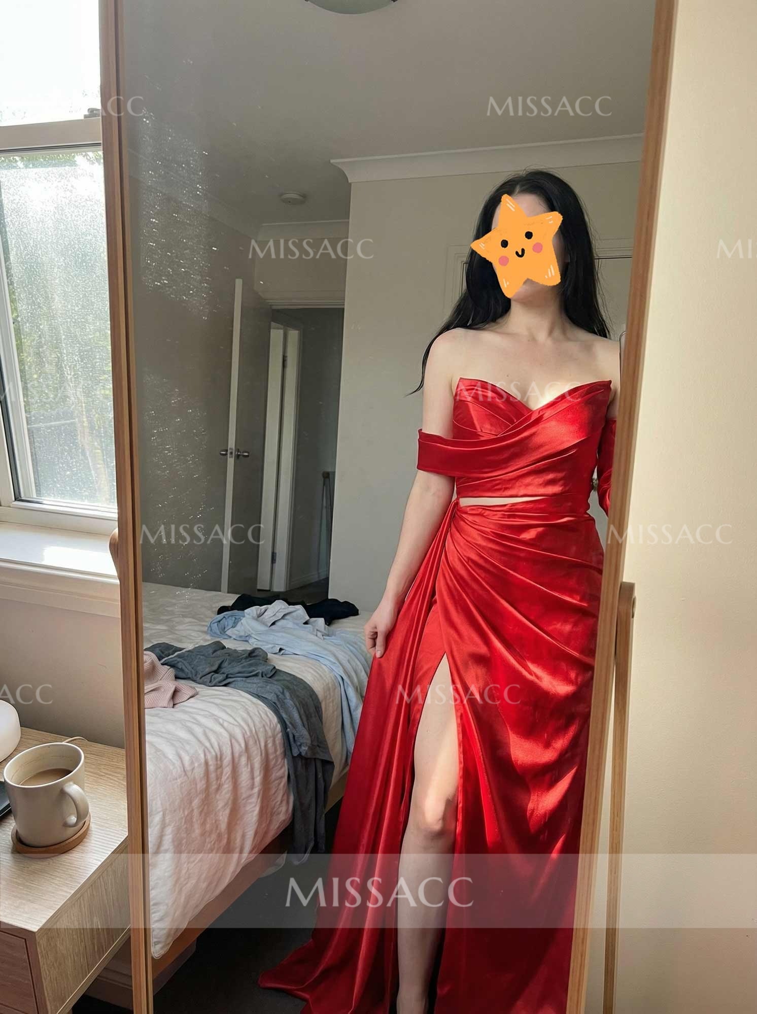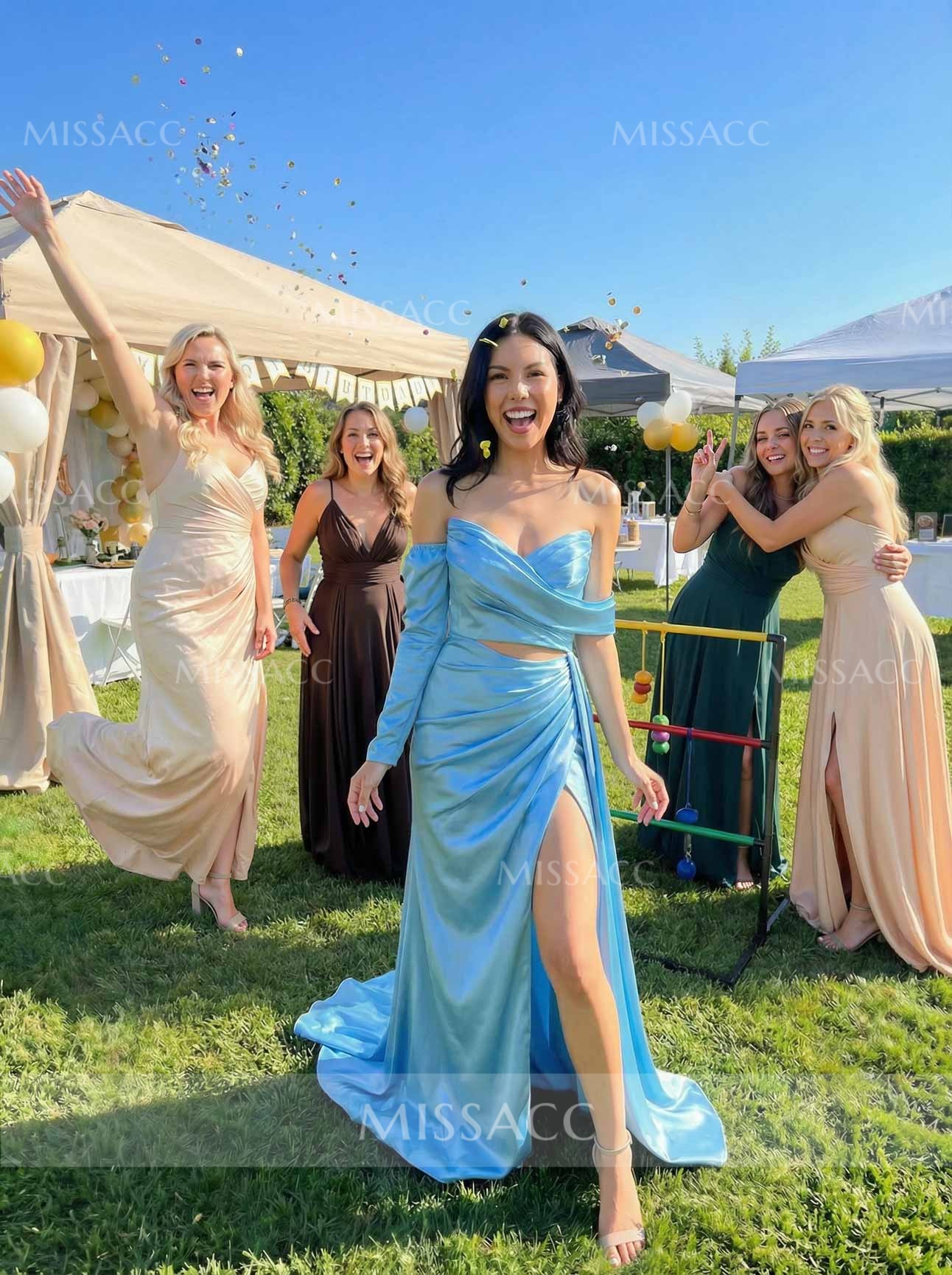 Glamorize any formal occasion with the Green Satin Strapless Cutout Front Split Column Ball Gown. Crafted from luxurious satin, this gown features a strapless neckline that elegantly frames your shoulders and a cutout silhouette that hugs your figure and accentuates your natural curves. The front split adds a bold touch, allowing you to stride with confidence.