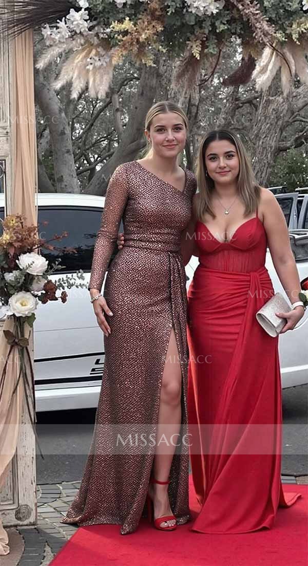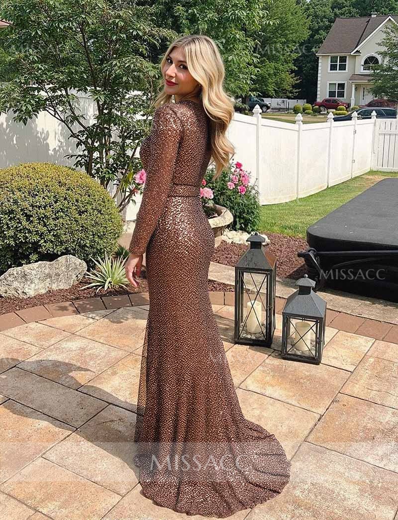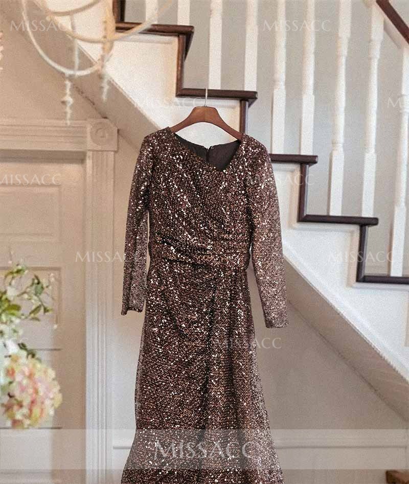 Shine in this sequined long sleeve evening dress featuring a dramatic sweeping side drape. Perfect for galas and red carpet events, this sparkling gown offers a flattering fit. Shop high-quality formal wear now.