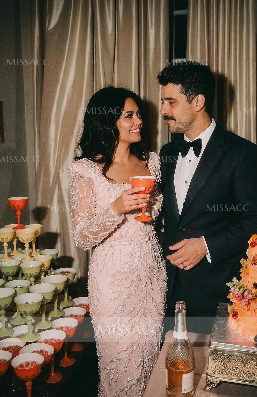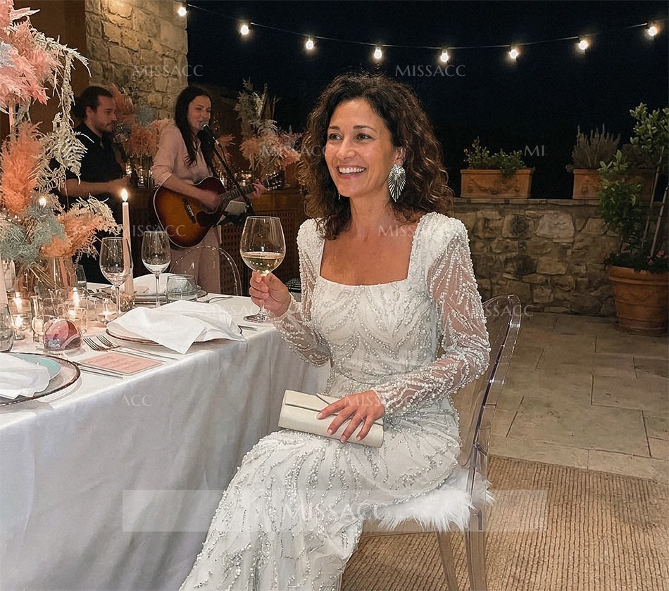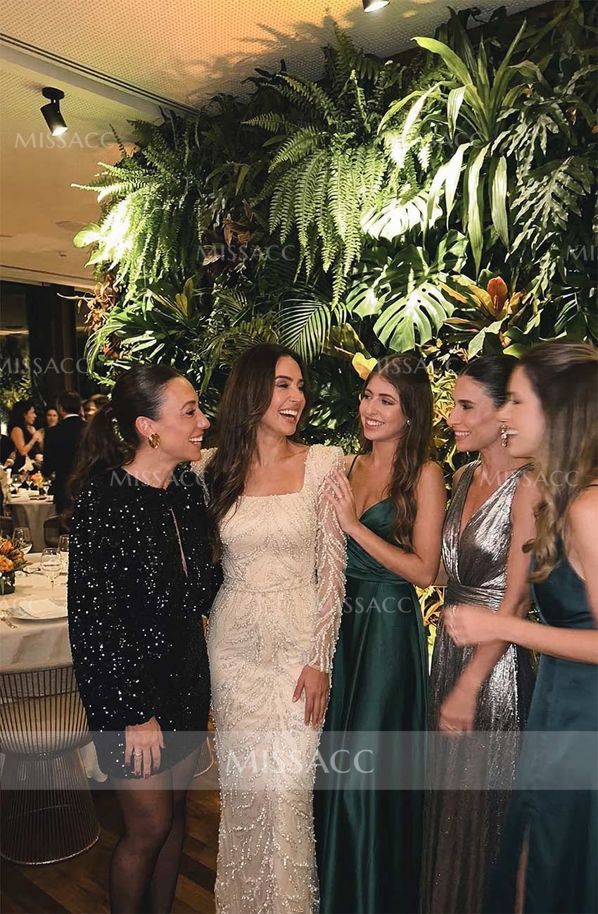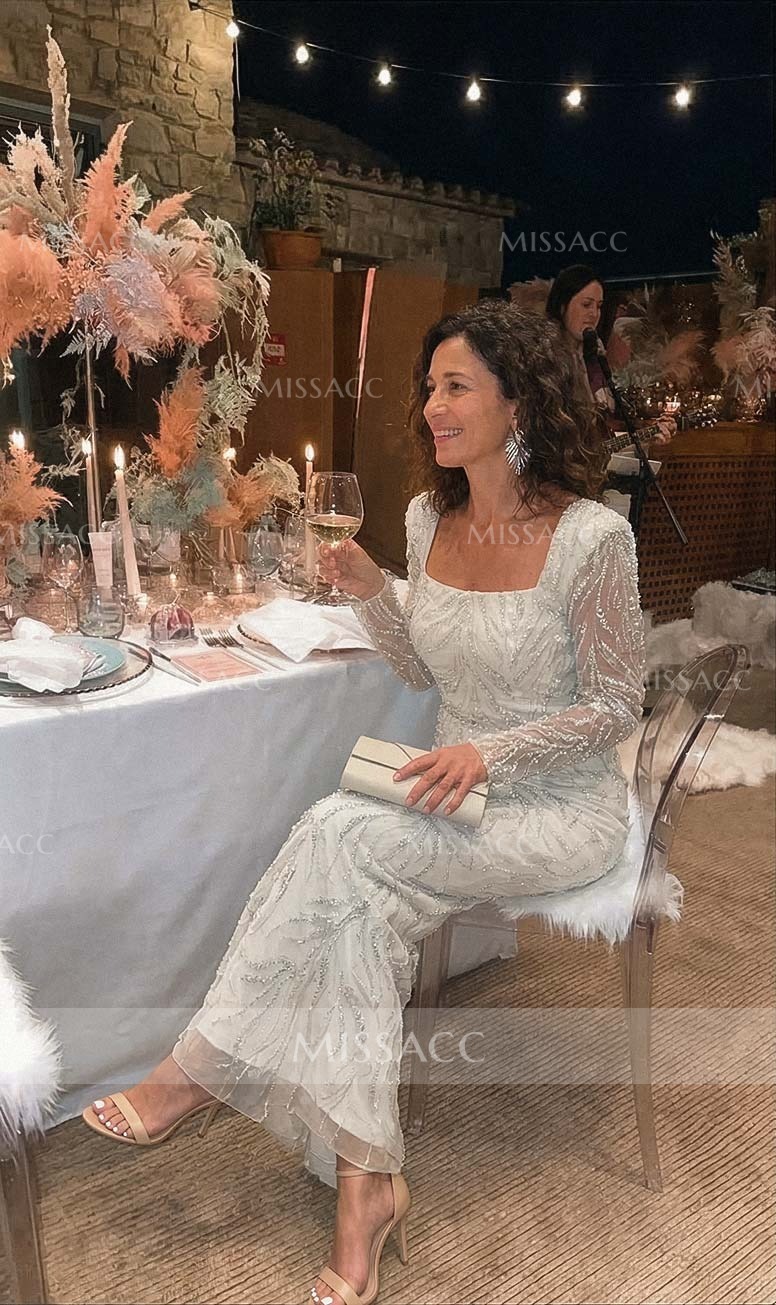 Luxury Square Neckline Long Sleeves Back Slit Floor-Length Evening Dresses #SED11838