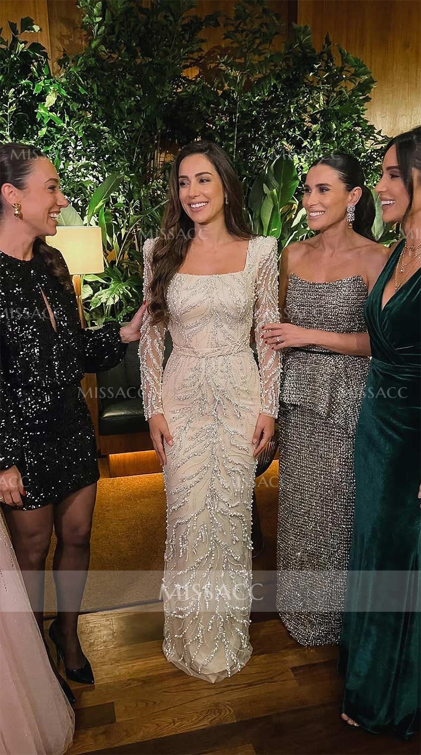 Luxury Square Neckline Long Sleeves Back Slit Floor-Length Evening Dresses