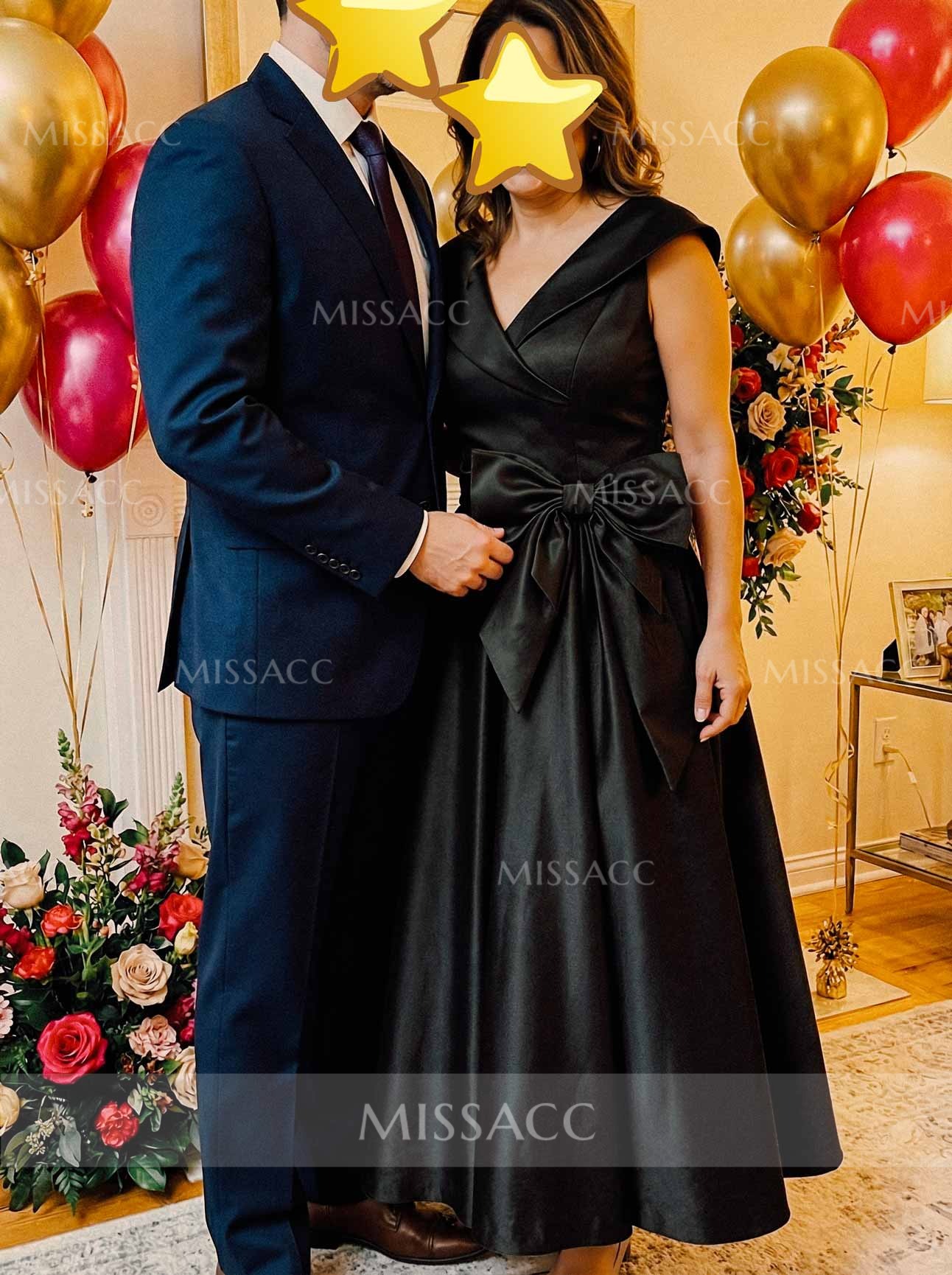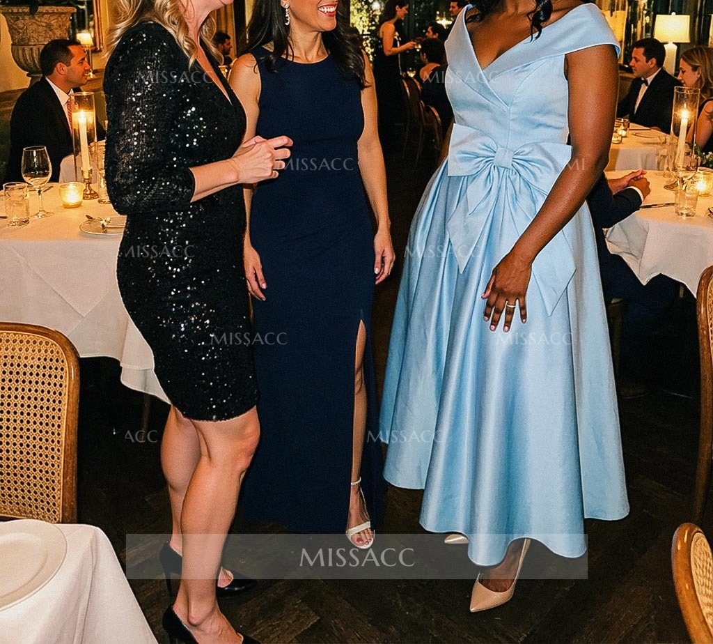This dress is a great find. The V-neck and cap sleeves are very flattering, and the bow accent adds a sweet touch. The satin material is smooth and drapes beautifully. It's a bit more casual than I anticipated, but it's perfect for a garden party or a brunch. The fit is spot on.