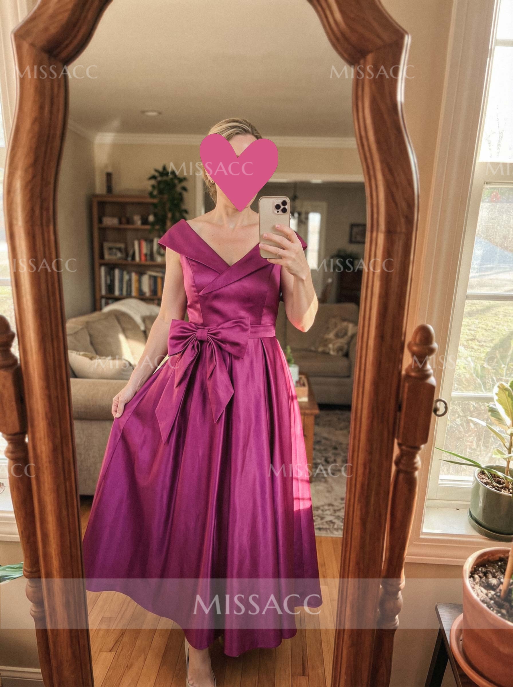 I recently purchased this satin dress and I'm quite pleased with it. The modest V-neck and cap sleeves give it a classic look, while the bow accent adds a touch of whimsy. The dress arrived quickly and was well-packaged. It's a bit more casual than I expected, but still perfect for a summer wedding.
