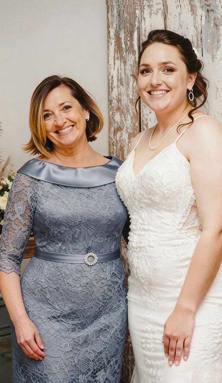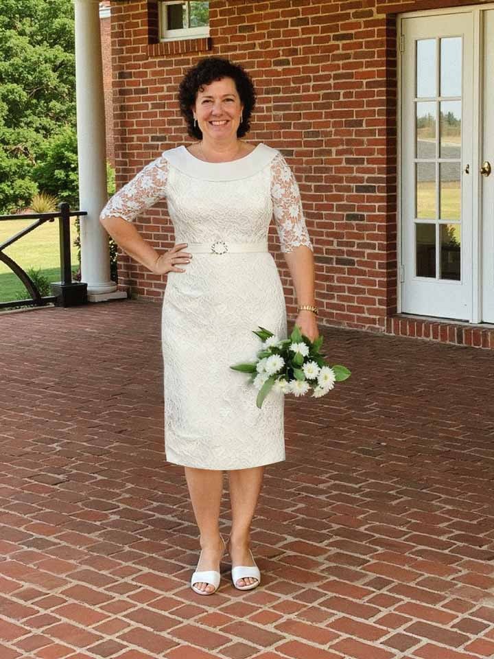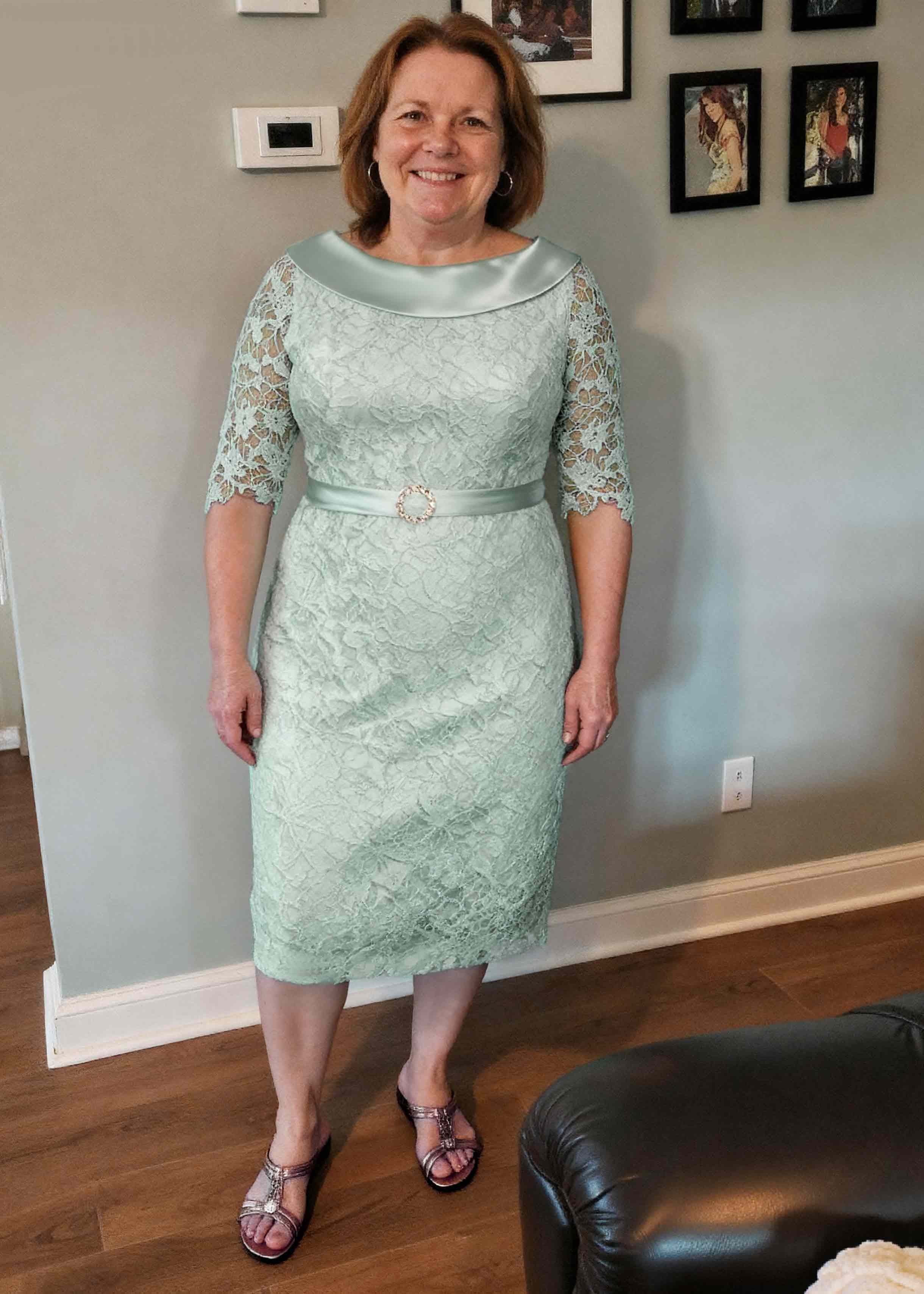 Stylish satin knee-length dress with lace detailing and beaded sheath column design, perfect for mother of the bride at weddings.