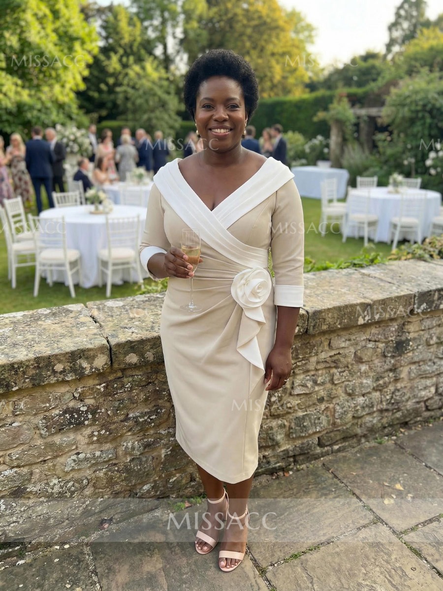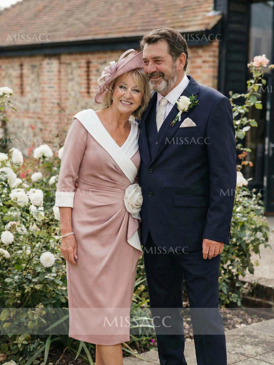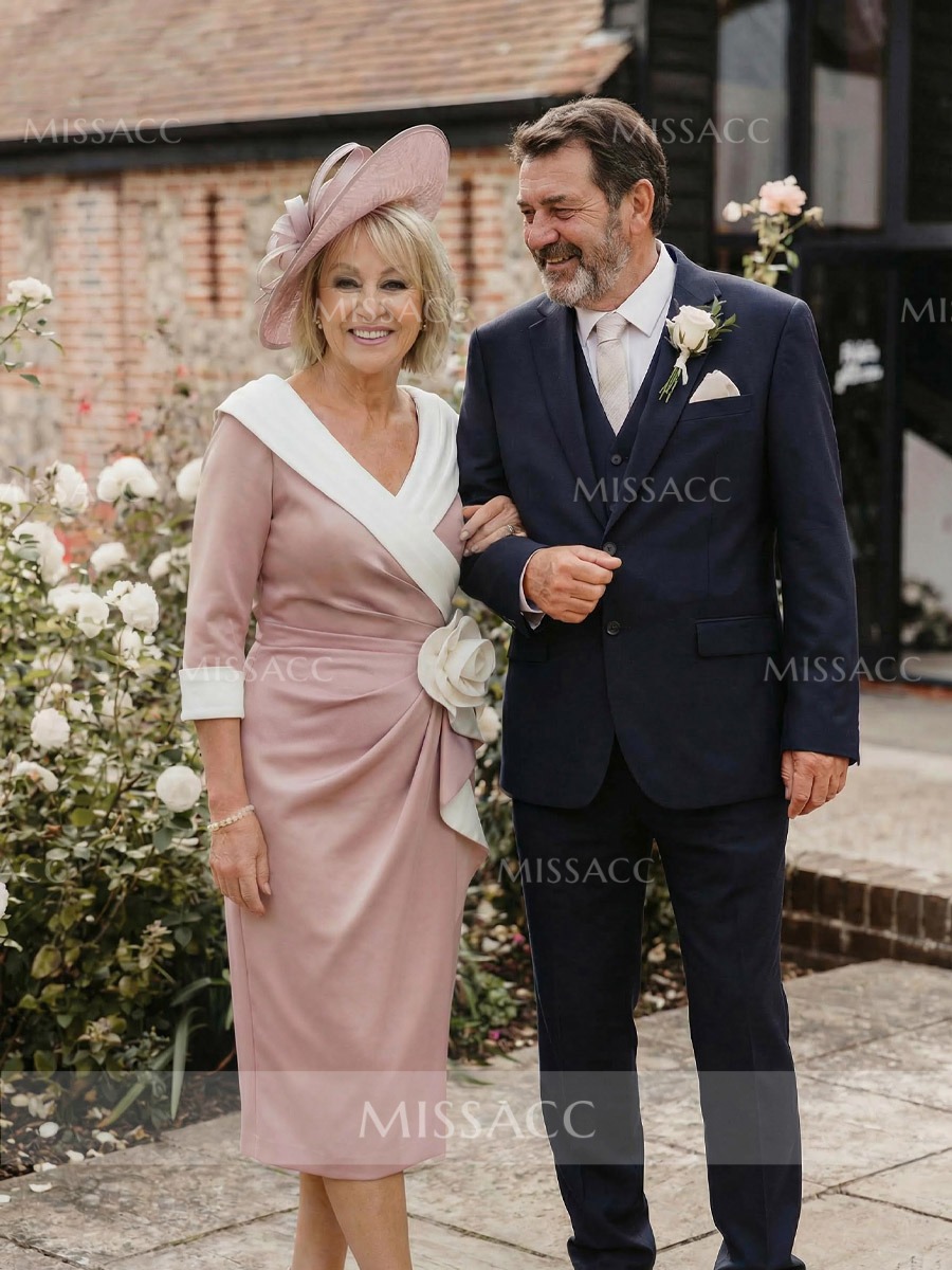 Discover our Sheath Column Elastic Satin Mother of the Bride Dress, featuring a slight stretch for comfort and a delicate flower design. Perfect for a chic wedding celebration.