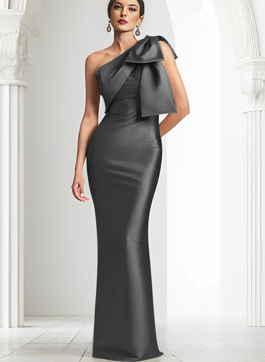 Look jaw-dropping as you walk into the special event in this spectacular dress.Wonderfully sculpted from satin fabric, this classy piece flaunts an asymmetrical neckline and a one-sleeve bodice along the oversized bow accent.The smooth full-length sheath skirt features a back slit for more leg movement. Be a showstopper for special occasions and weddings