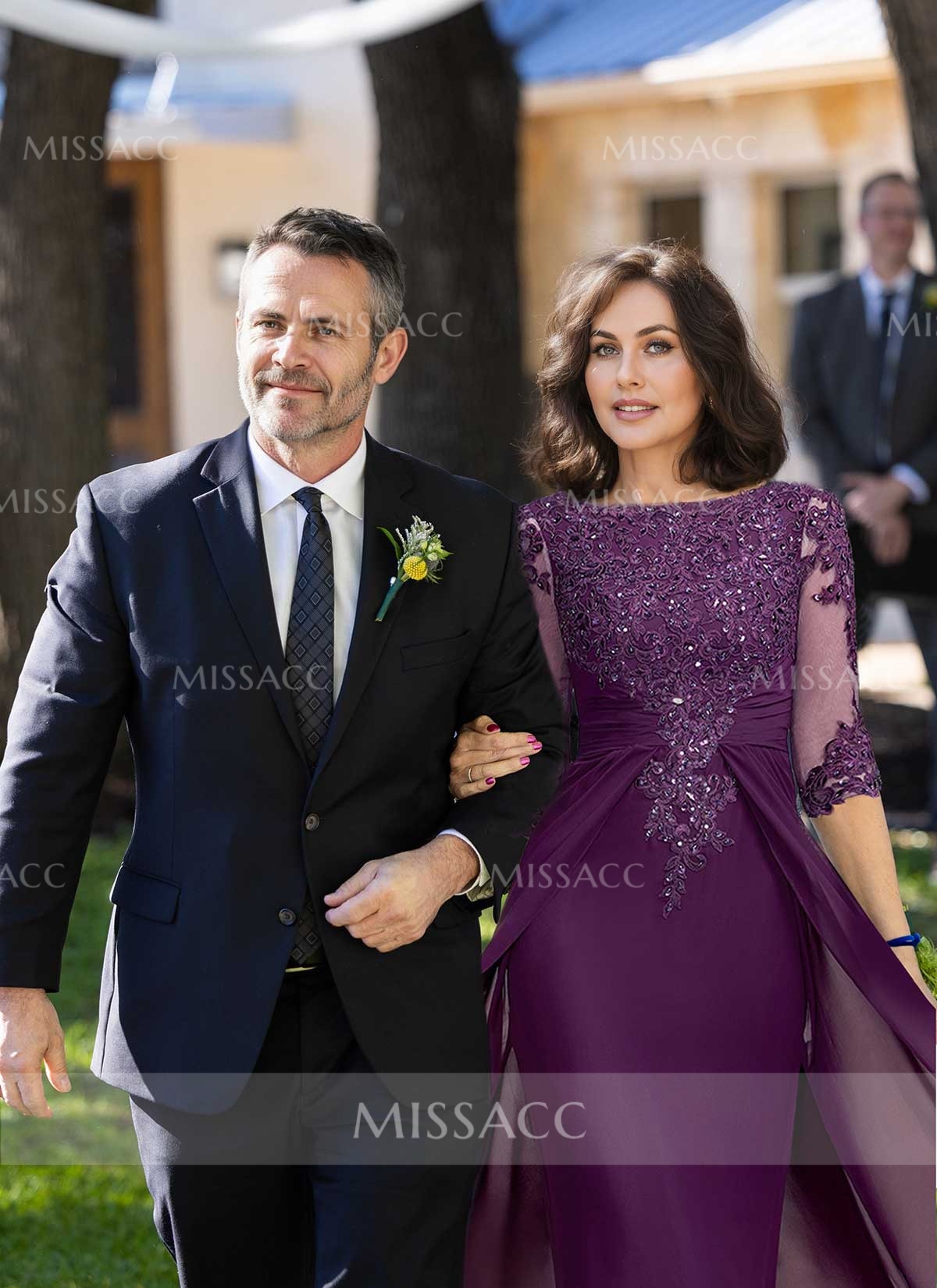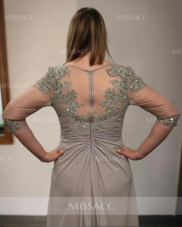 Discover our chic sheath column mother-of-the-bride dress, featuring a scoop neck and lace details. Perfect for a sophisticated wedding event, this chiffon dress with 3/4 sleeves offers a touch of elegance and grace.