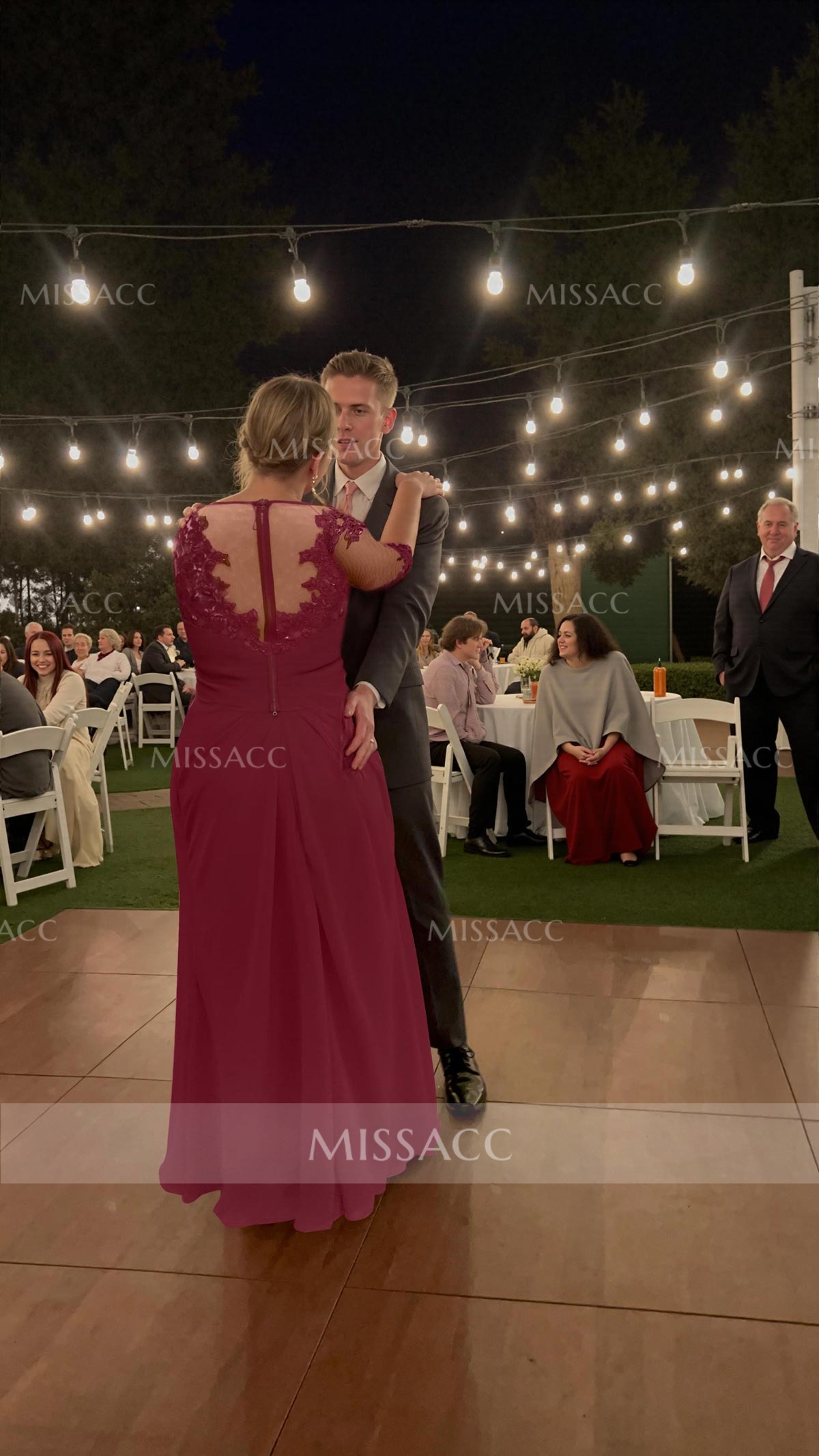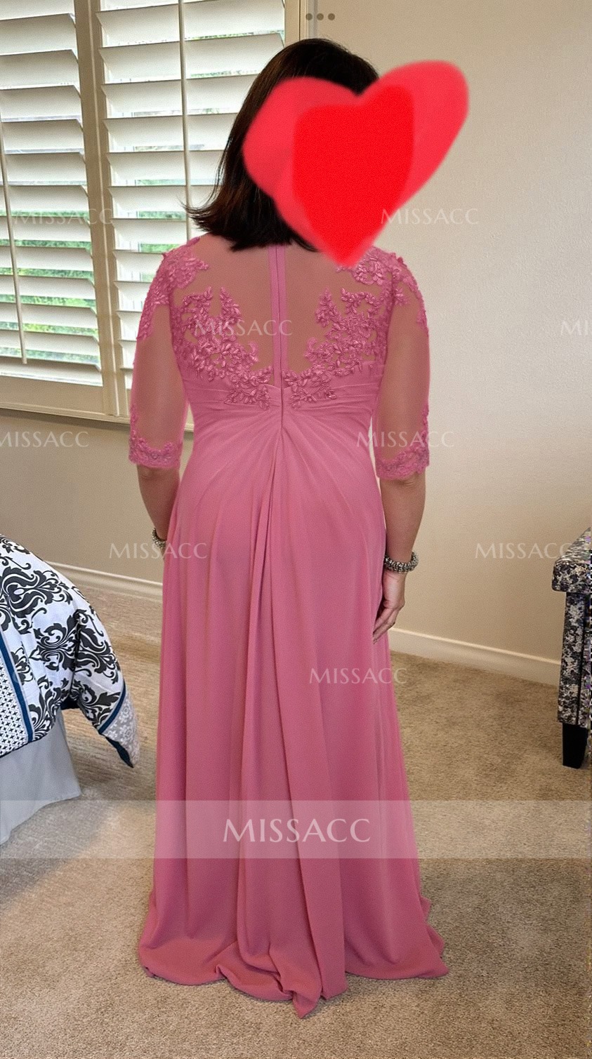 Just received this chiffon dress and I'm quite happy with it! The scoop neck is really flattering, and the 3/4 sleeves offer a nice bit of coverage. It arrived super fast and was exactly as described. It's comfortable to wear, and the lace detailing is beautifully done. I'd definitely recommend this for a formal event!