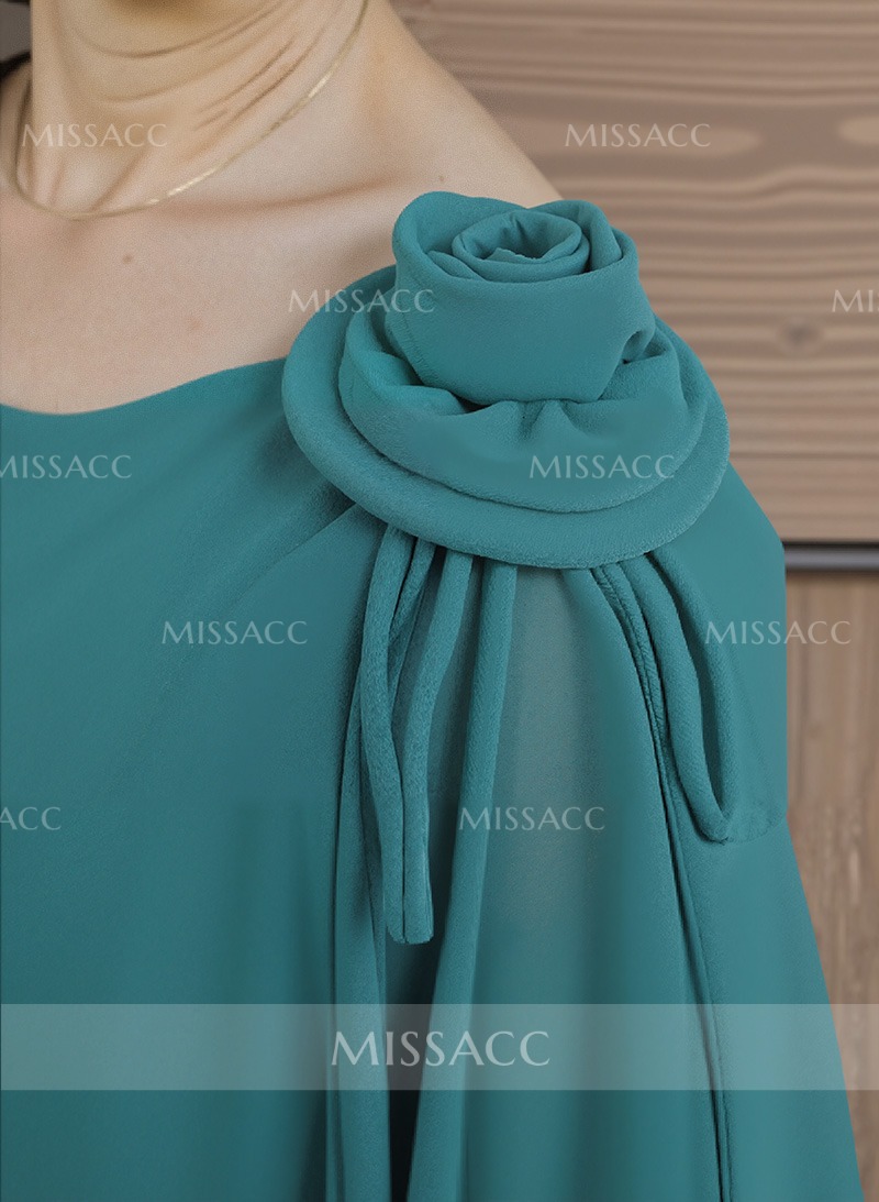 Elegant Sheath Column Dress with a Scenic Chiffon Overlay, featuring a Delicate Scoop Neck and Flower Embellishments. Perfect for Mother of the Bride on Special Occasions.