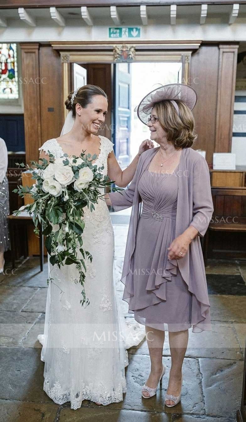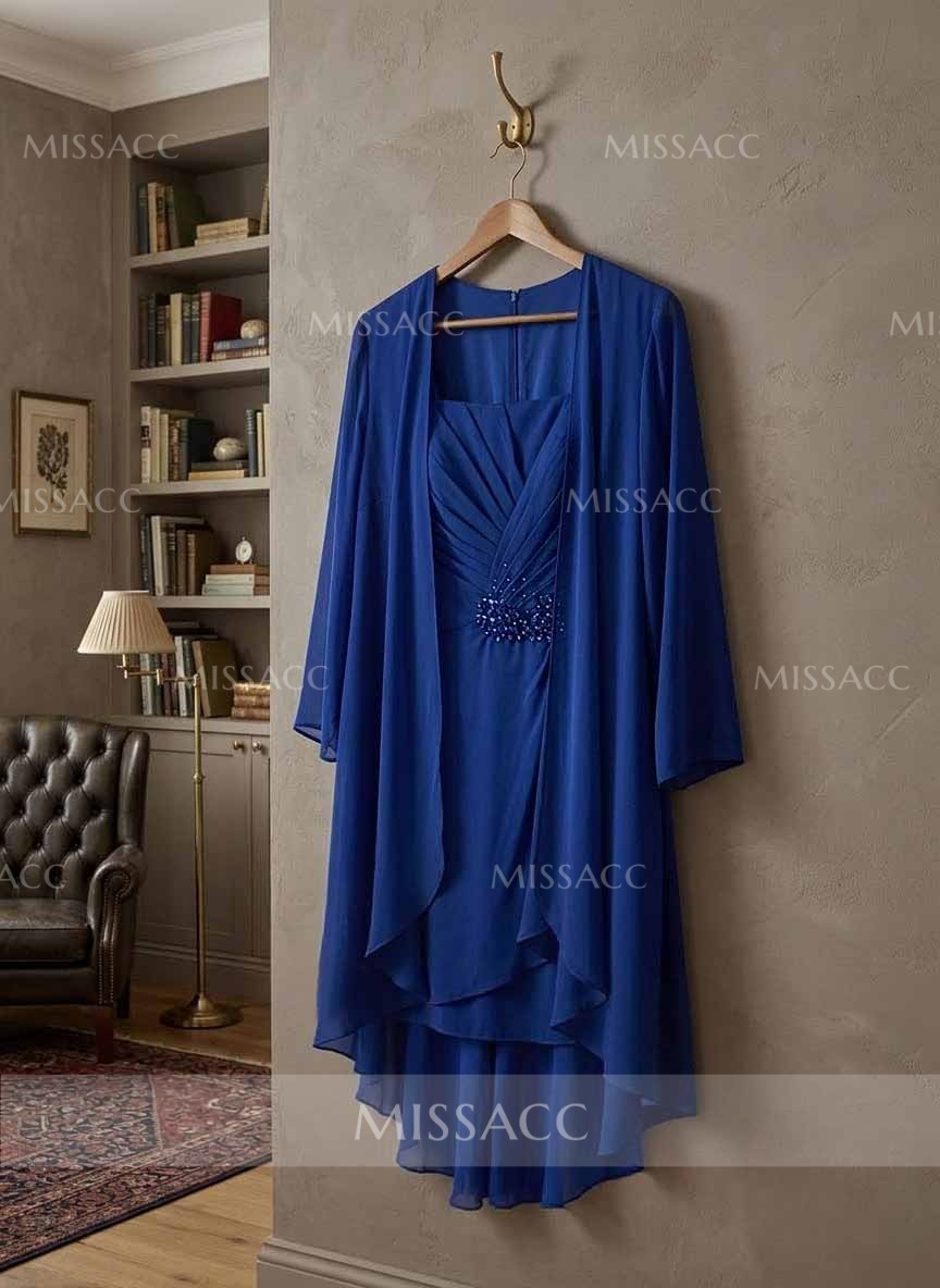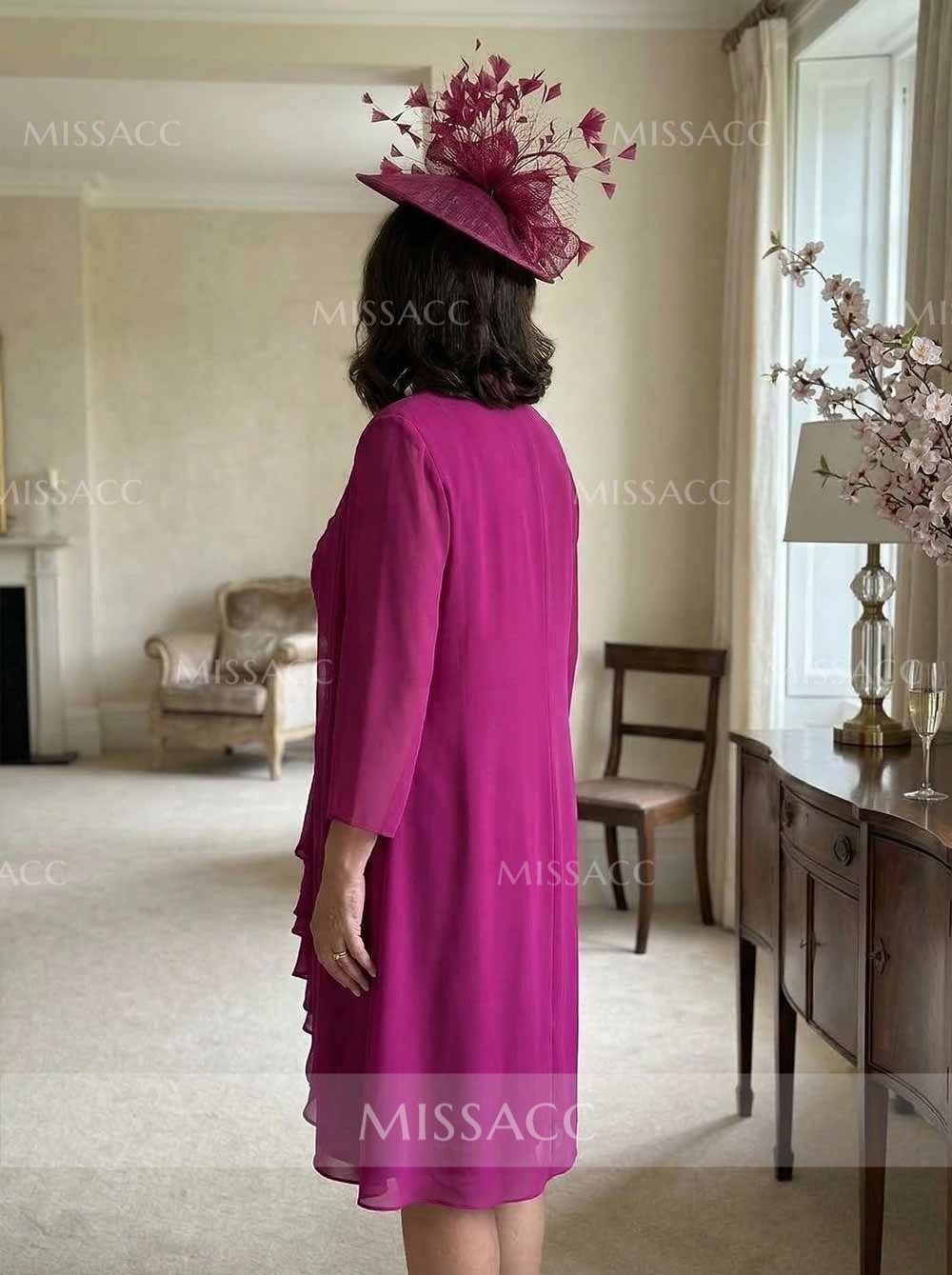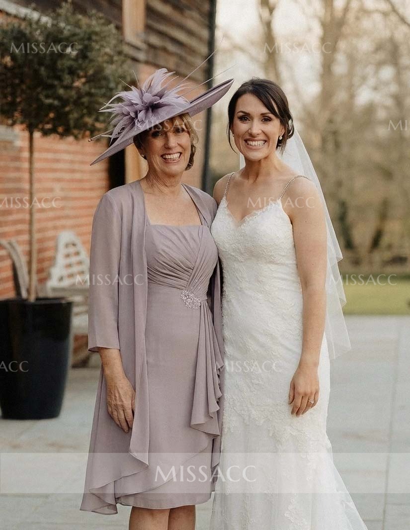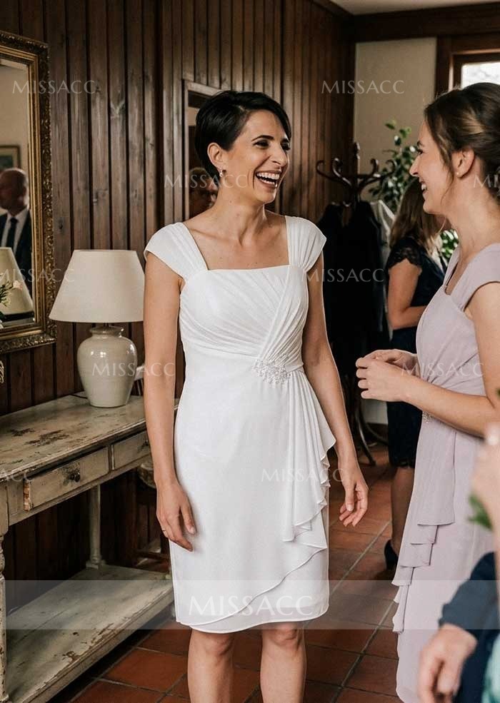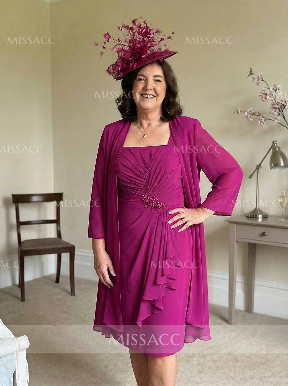Elegant sheath column dress with a square neckline and 3/4 sleeves, crafted from flowing chiffon. Perfect for mother of the bride, this knee-length dress features a pleated design for a sophisticated look. Ideal for special occasions.