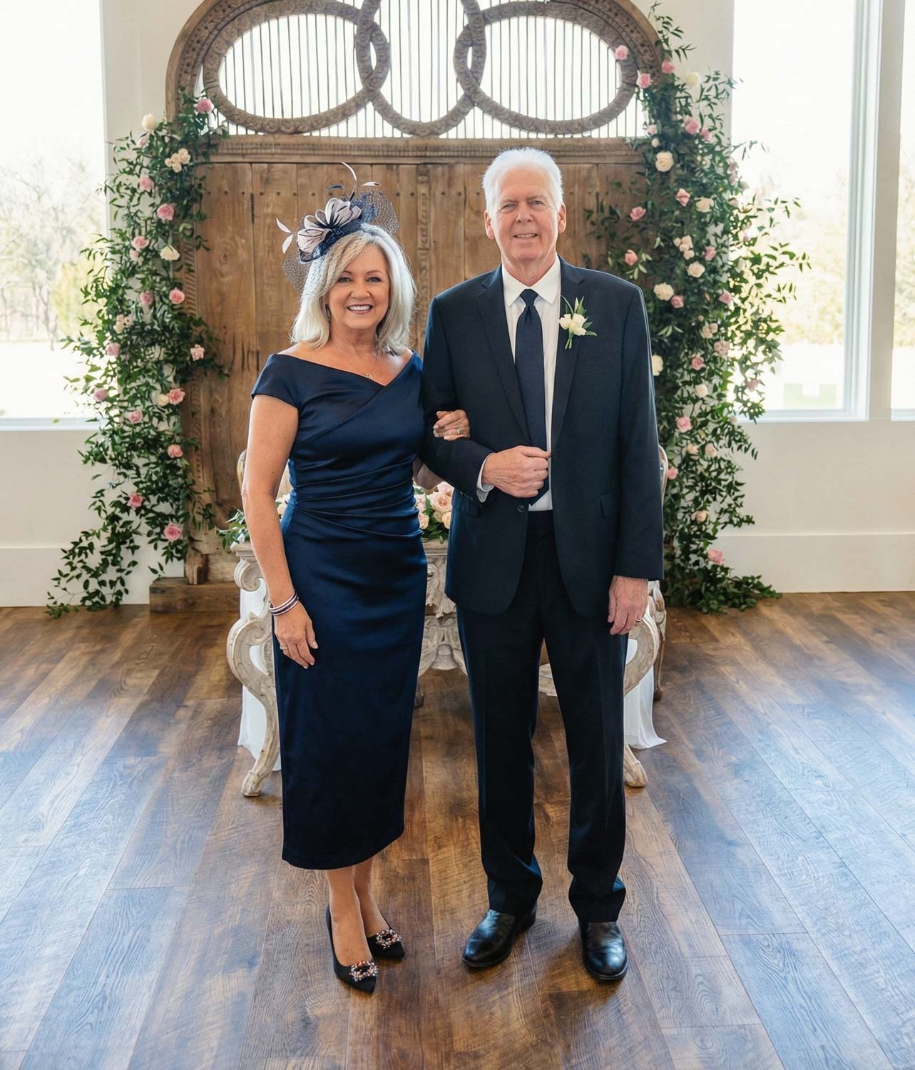 Satin cocktail dress with a sheath column silhouette and V-neckline, featuring 3/4 sleeves and a floral embellishment for a chic, formal event look.
