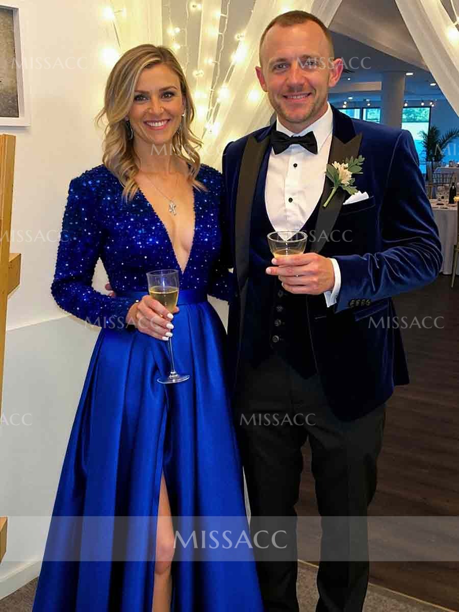 Captivate everyone in this charming look by this evening dress. Mesmerizes in a long sleeves, plunge v-neckline. The back has a zipper up closure while the vibrant satin skirt flares a grandiose A-line silhouette with thigh-high front slit. Claim that queenly look on this years Prom wearing this evening dress.