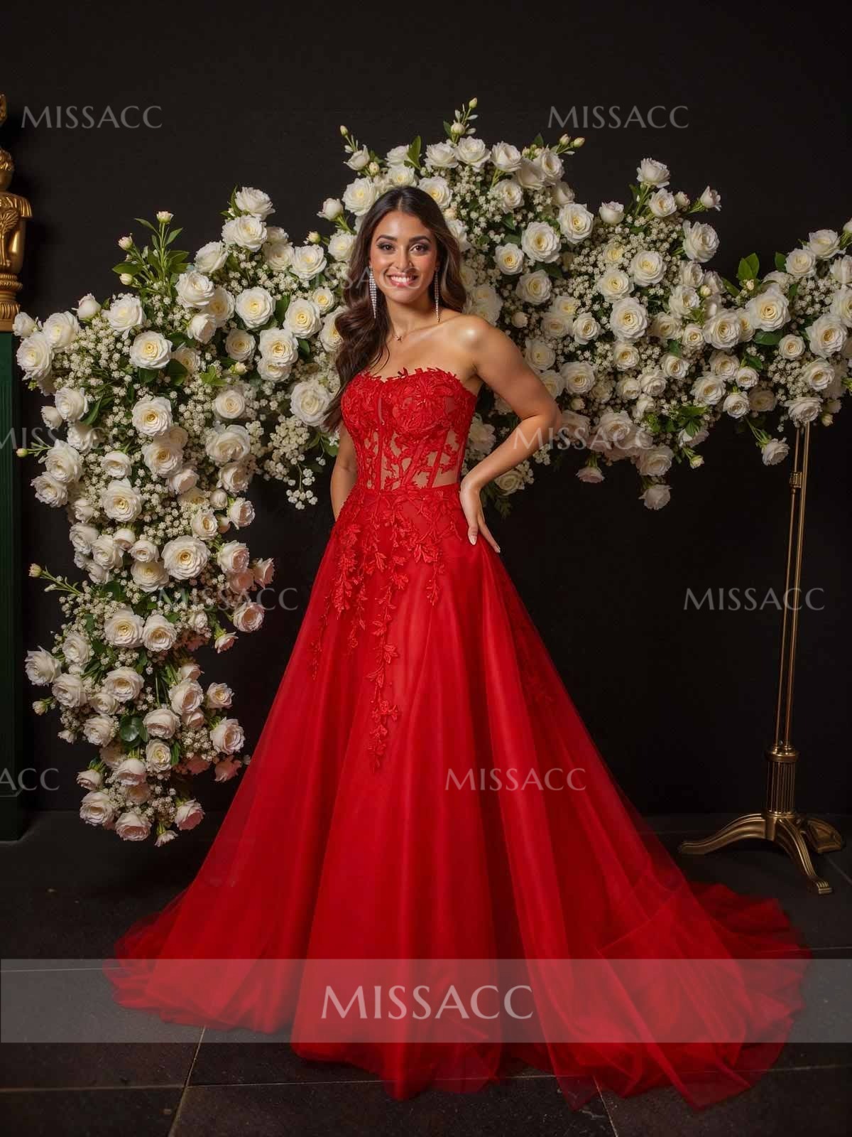 This red strapless gown is an absolute showstopper against the all-white flower wall! The intricate lace cutouts on the bodice add a delicate edge to the bold color, and the flowing tulle skirt creates soft movement that balances the gown’s striking hue. Every detail—from the fitted torso to the cascading skirt—works together to make a dramatic, elegant statement; it’s the kind of gown that turns heads the second you walk in a room.