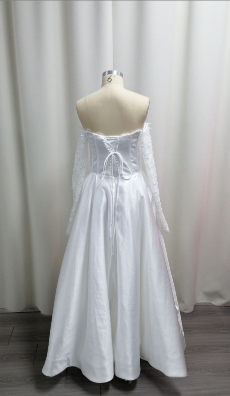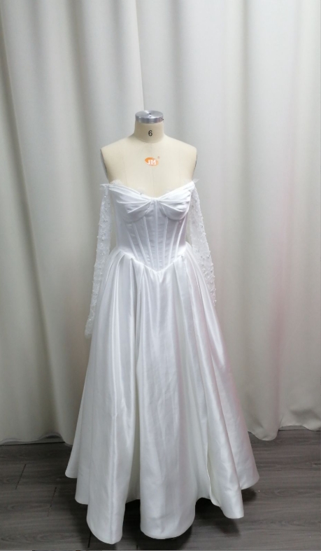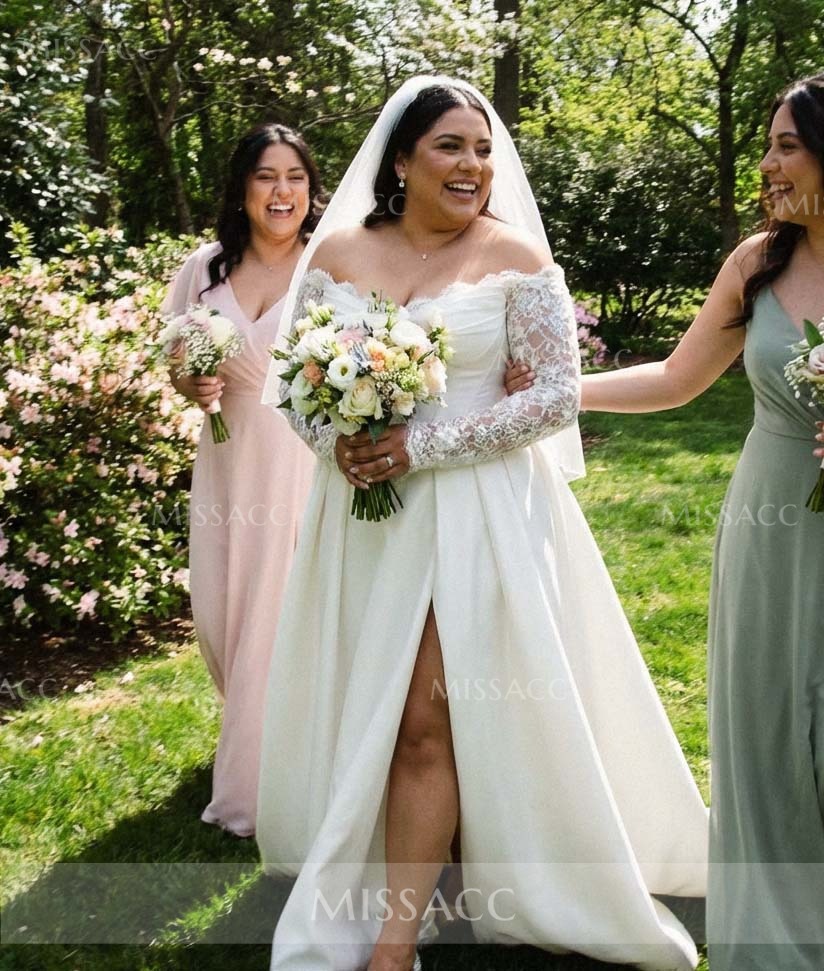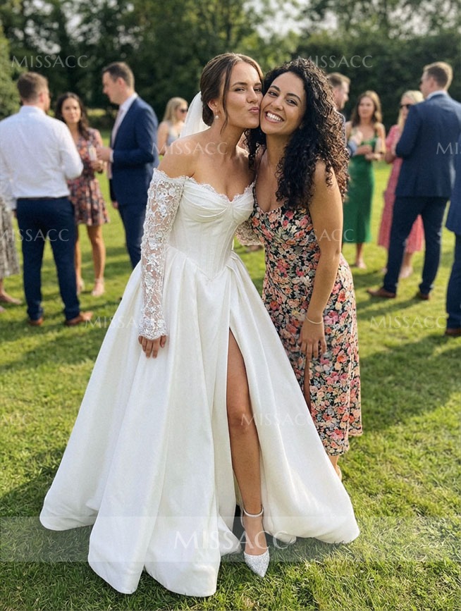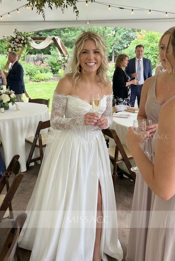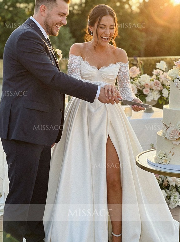Featuring matte satin and intricate lace, this off-the-shoulder A-line wedding dress showcases a sweetheart neckline and high split. Perfect for romantic church or garden ceremonies, it blends timeless style with modern allure.