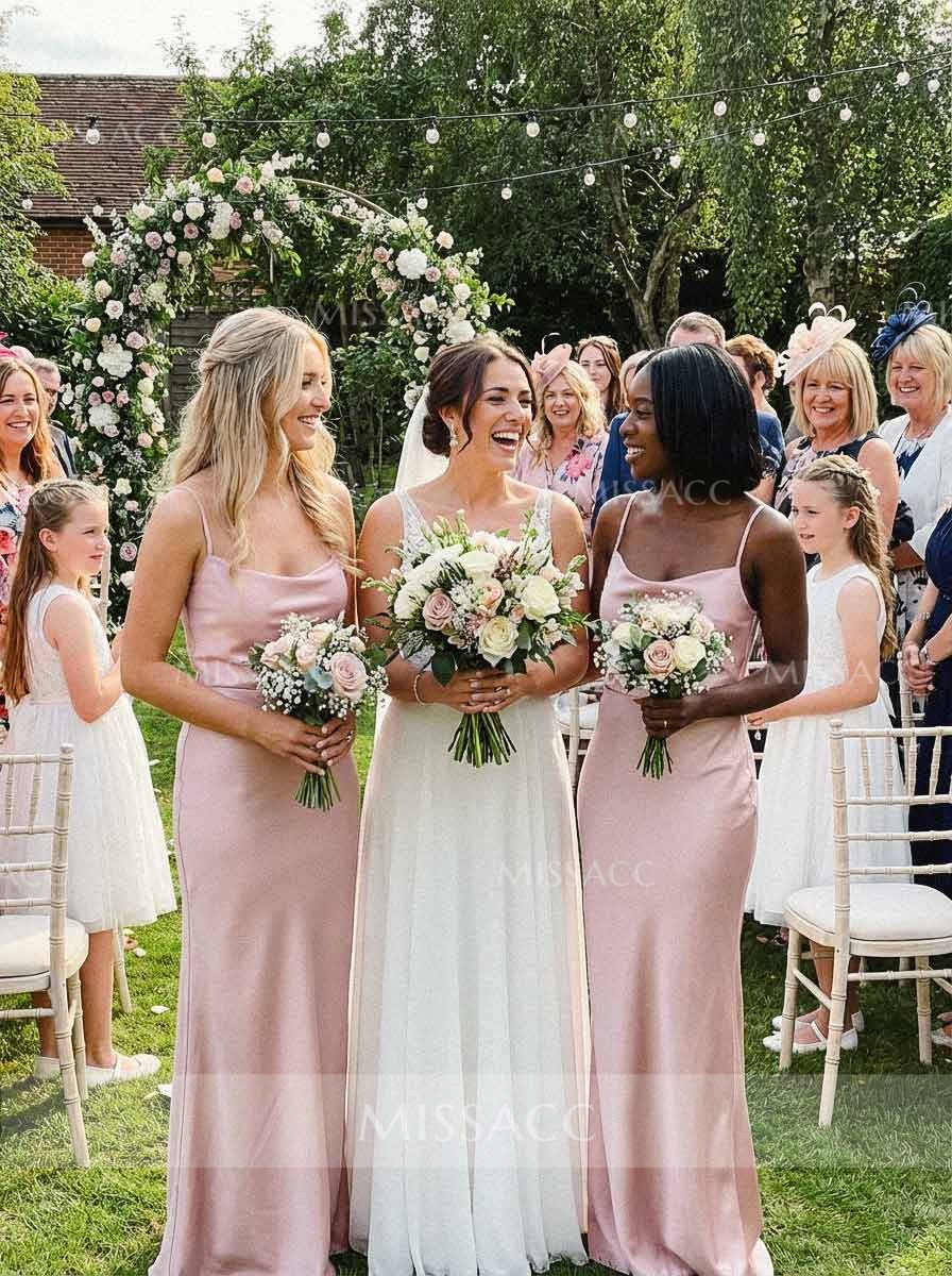 Stunning satin bridesmaid dress with a trumpet silhouette and cowl neck, perfect for a sophisticated wedding event.