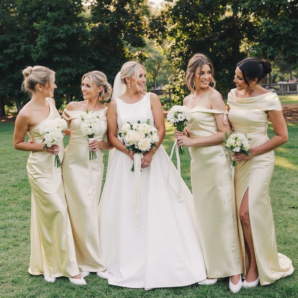 This bridesmaid dress is a winner! My friend chose it for her wedding, and all of us felt amazing in it. The charmeuse fabric is soft and shimmery, and the fit was pretty true to size. I'm not particularly tall, so the sweep train was a bit long, but nothing a few safety pins couldn't fix for the reception. Overall, a really lovely and comfortable dress for the bridal party.