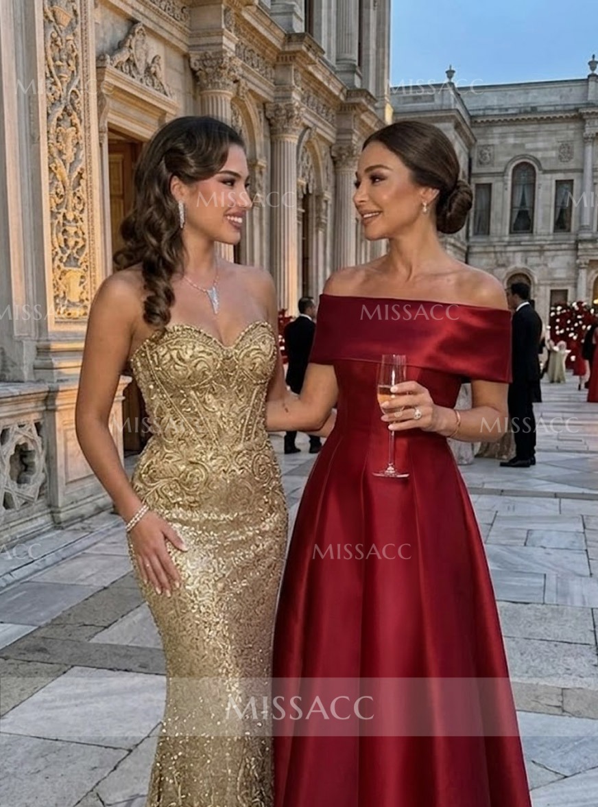 Stunning off-the-shoulder mermaid silhouette satin evening dress, perfect for special occasions. Graceful and chic, this dress is a must-have for any wardrobe.