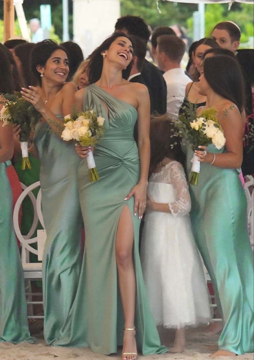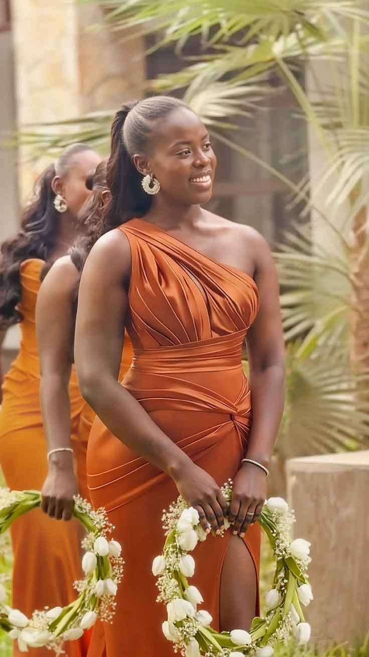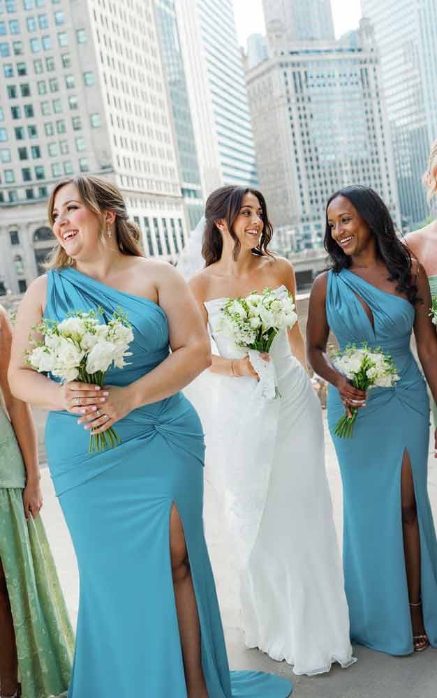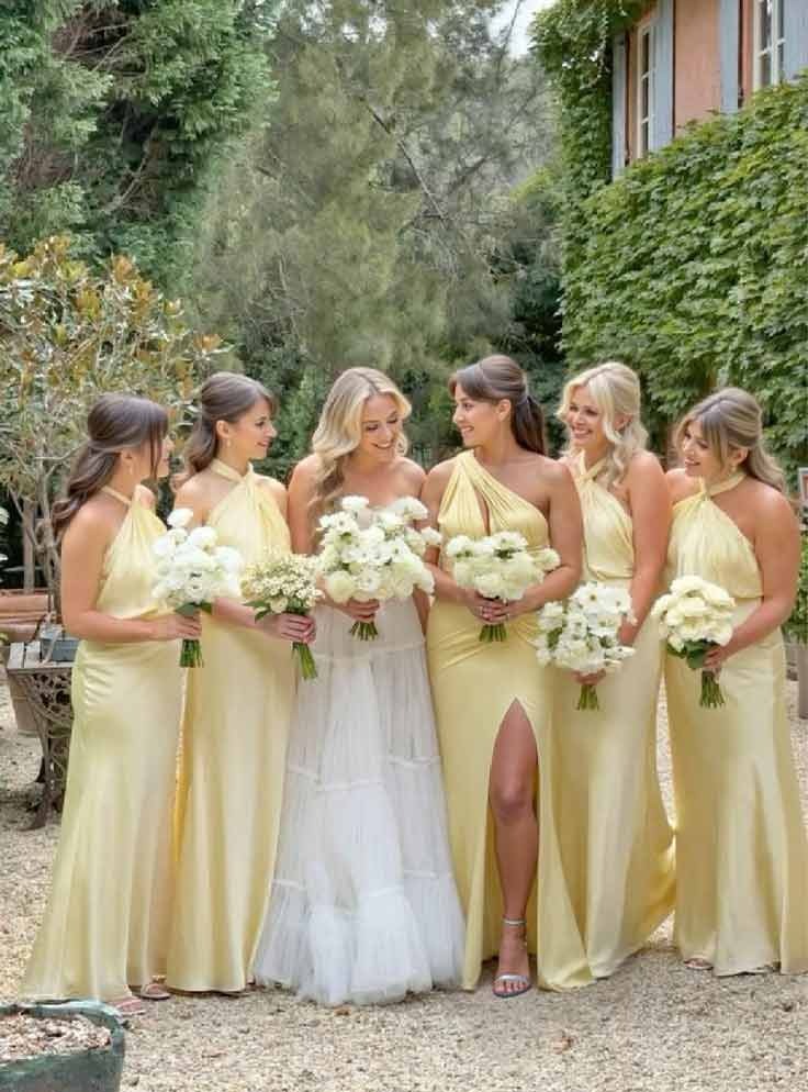Charmeuse bridesmaid dresses with a trumpet silhouette, one-shoulder design, and a dramatic sweep train. Perfect for a chic wedding celebration.