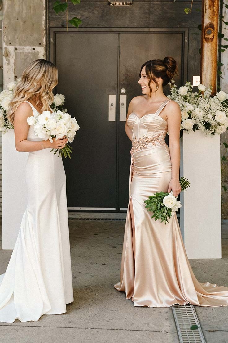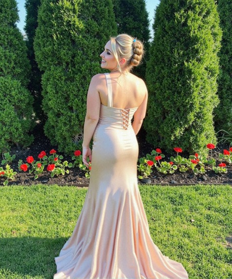 Five stars for the fit and detail on this gown! I chose the beautiful satin in the champagne color, and the material is just divine—it has a smooth, rich sheen that looks incredibly expensive. The high slit and slight mermaid flare create a stunning silhouette, but the real highlight for me is the back. The lace-up corset detail is an unexpected, edgy touch that ensures a custom-feeling, body-hugging fit while adding major style points. It looks fantastic walking away, and the quality of the tailoring is evident. It's a gorgeous blend of classic elegance (satin fabric) and modern flair (corset back). Perfect for outdoor photoshoots as the dress shines beautifully in the sunlight!