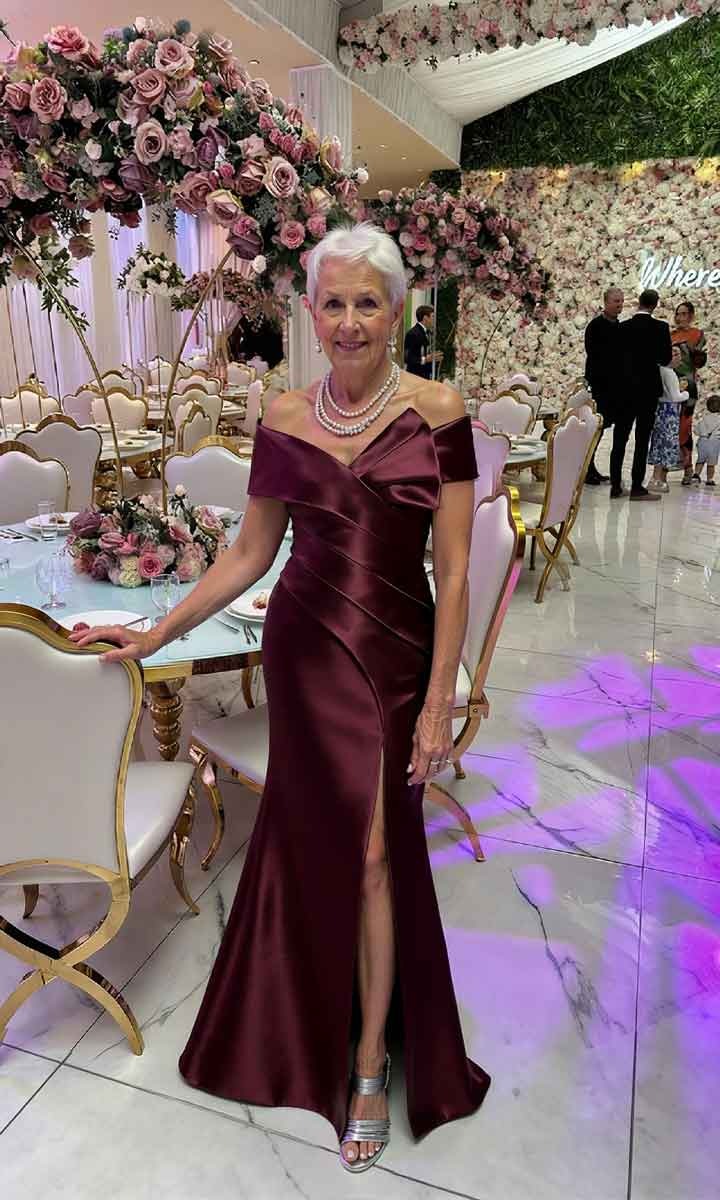 Luxurious satin evening dress with a trumpet silhouette and mermaid sleeves, perfect for special events and red-carpet glamour.