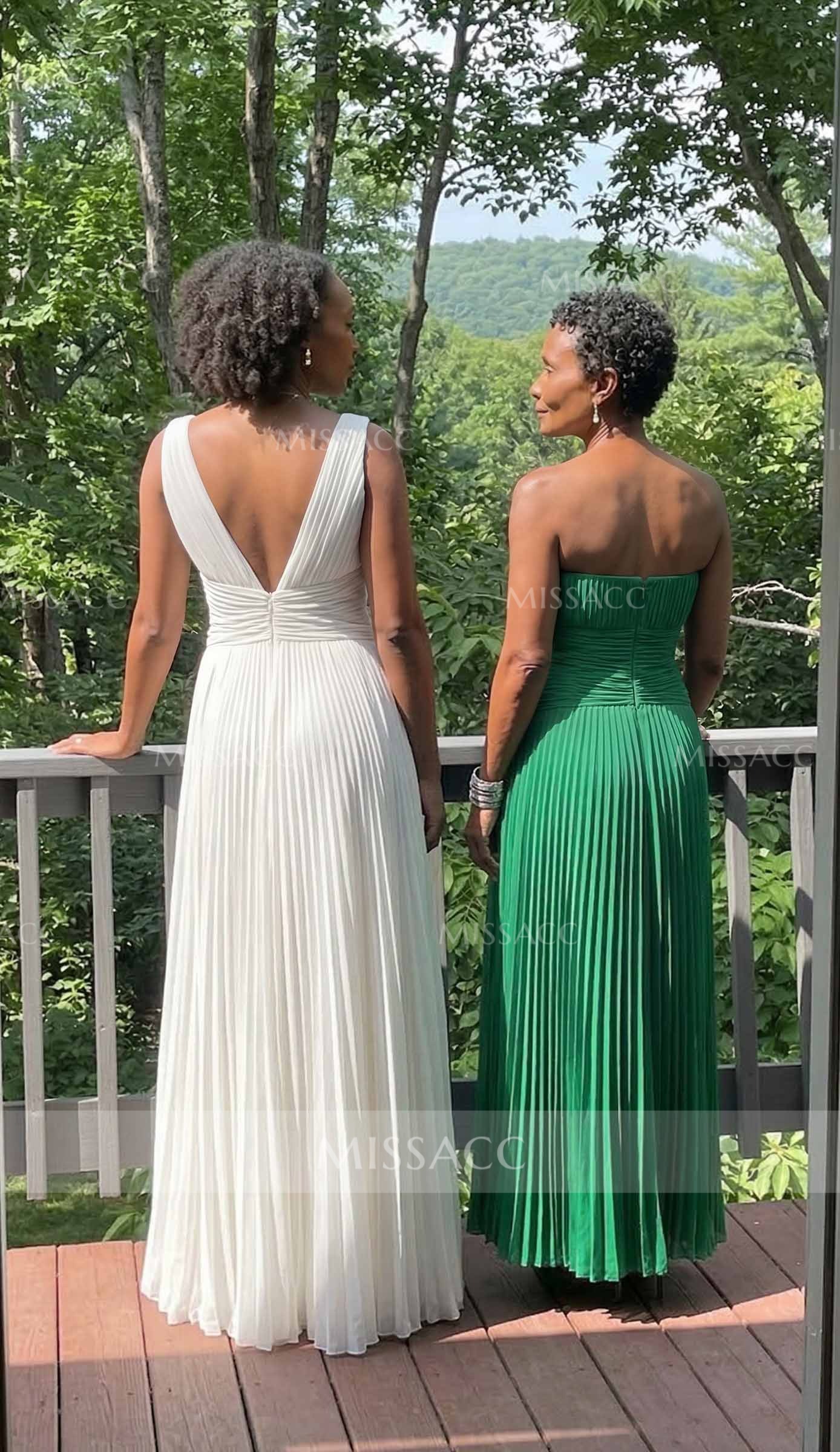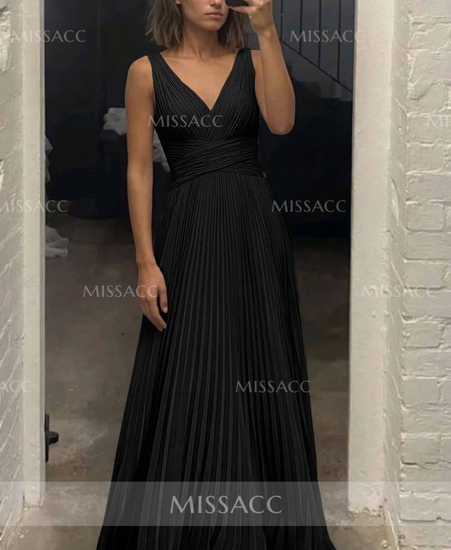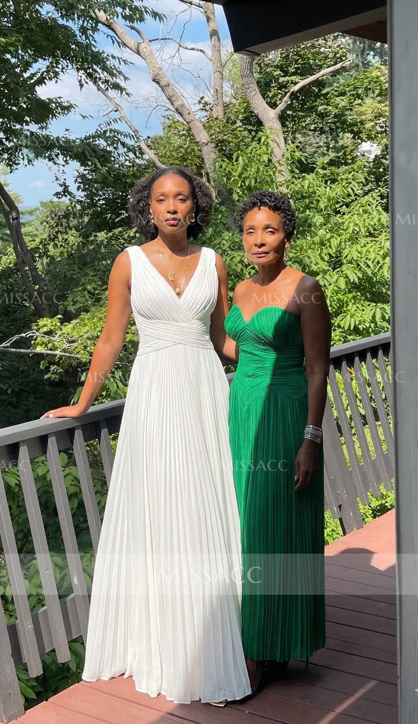 Intricate pleated chiffon A-line evening dress, featuring a flattering V-neck design, perfect for special occasions and red carpet events. Soft, flowy fabric for a chic look.